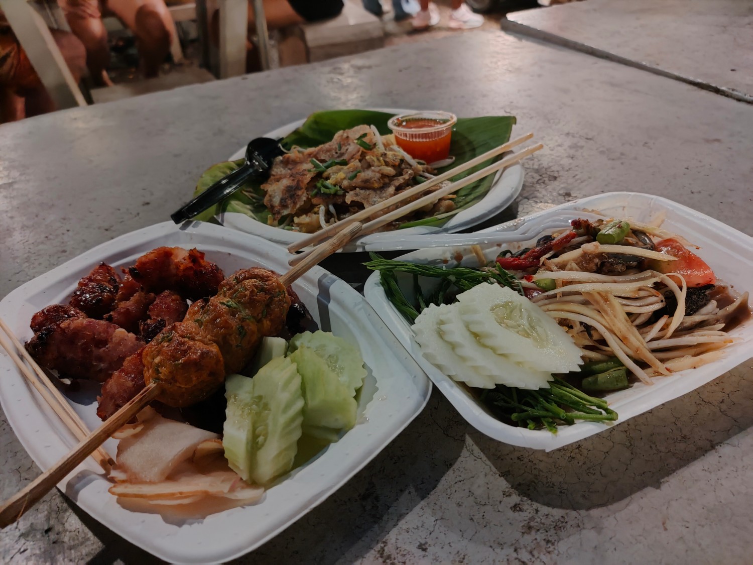 อันนี้คือของกินที่เรากินกันตรงตลาดต้นมะขาม พอดีมันอยู่ติดกับ Cicada Market แต่เรามาที่นี่ก่อน หอยทอดถือว่าใช้ได้นะ ส้มตำอร่อยมาก