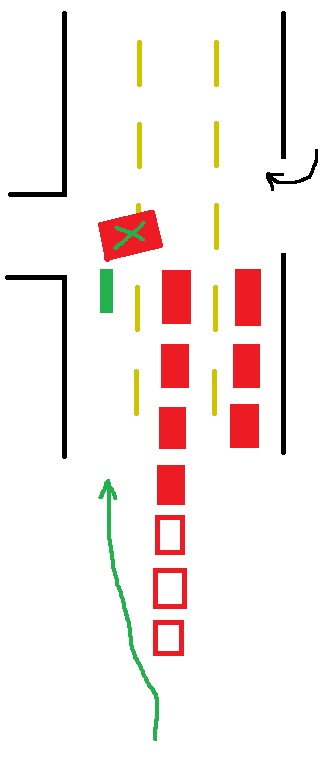 ตามรูปข้างล่างนี้ครับเหตุเกิดแถวๆถนน นวมินทร์(สุขา1) เป็นที่กลับรถแต่รถตัดเข้าซอย เนื่องจากว่ารถที่ตัดเข้ามามันชิดคันที่อยู่เลยกลางมาก ผมเลยมองไม่เห็น ก่อนที่จะเกือบปะทะกันผมอยู่เลนกลางแต่ชิดไปทางซ้ายไม่คร่อมเส้นปะ ทีรถติดตรงที่กลับรถราว 3-4 คัน และระยะว่างหลังจากนั้นราว 3-4 คัน ผมเปลี่ยนเลนไปซ้ายสุดเนื่องจากว่างแต่ไม่ได้ลดความเร็วลงมามาก กะระยะแค่ว่าถ้ารถกลับรถเบรคทันแน่นอนถ้าเห็นที่ความเร็วตอนนั้น แต่มีรถโผล่มาตัดเข้าซอย มันชิดมากว่านั้น แล้วมองไม่เห็นจนหน้ารถโผล่มาแล้วเพราะมันชิดคันที่อยู่เลยกลาง เบรคสุดตัว ผลคือไม่ชนแต่เอียงรถไปทางขวาเตรียมรับแรงปะทะแล้วระยะที่เห็นยางหน้าห่างจากกันชนมุมคันหน้าตอนหยุดสนิทคือ ห่างแบบเอาสันมือลอดไม่ได้