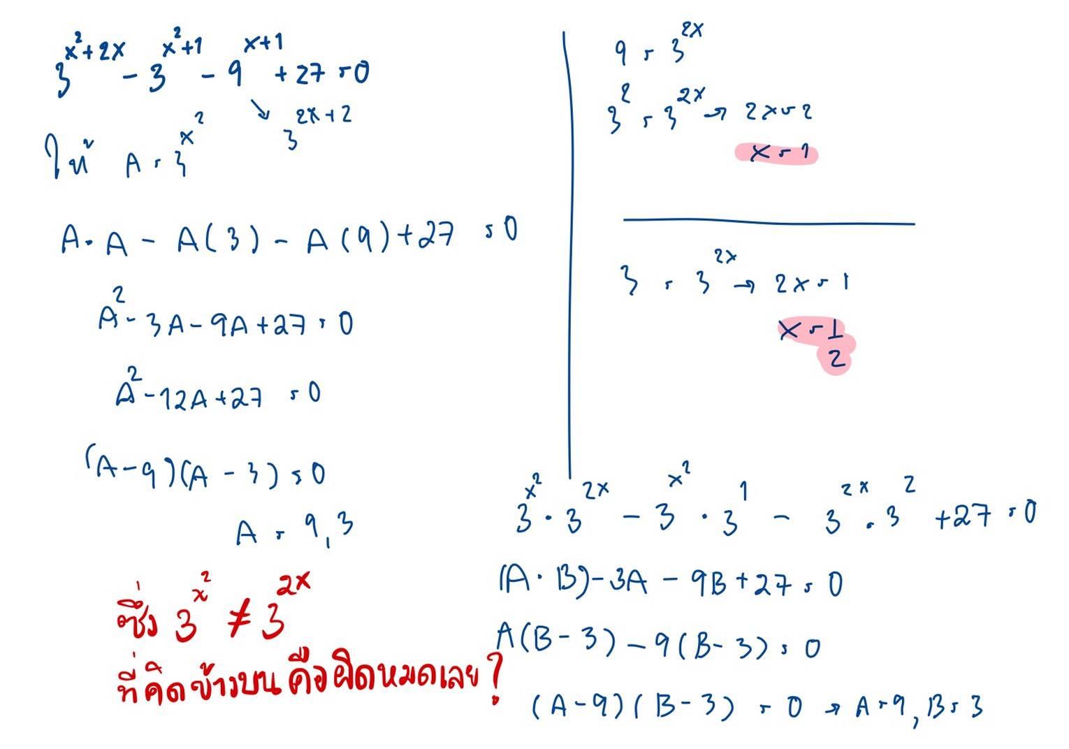 ส่วนข้อที่สอง ลองทำกับเพื่อนๆ แต่คุยไปคุยมา ลองแทนค่า 3^(2x) มันไม่เท่ากับ 3^(x^2) แต่เราก็สงสัยว่าตามที่เรียนมาเค้าก็สอนว่าเท่ากัน งงมากค่ะ