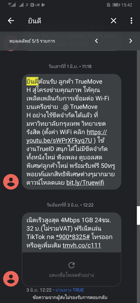 ได้รับข้อความยินดีต้อนรับเข้าสู่เครื่อข่าย true-move ...........