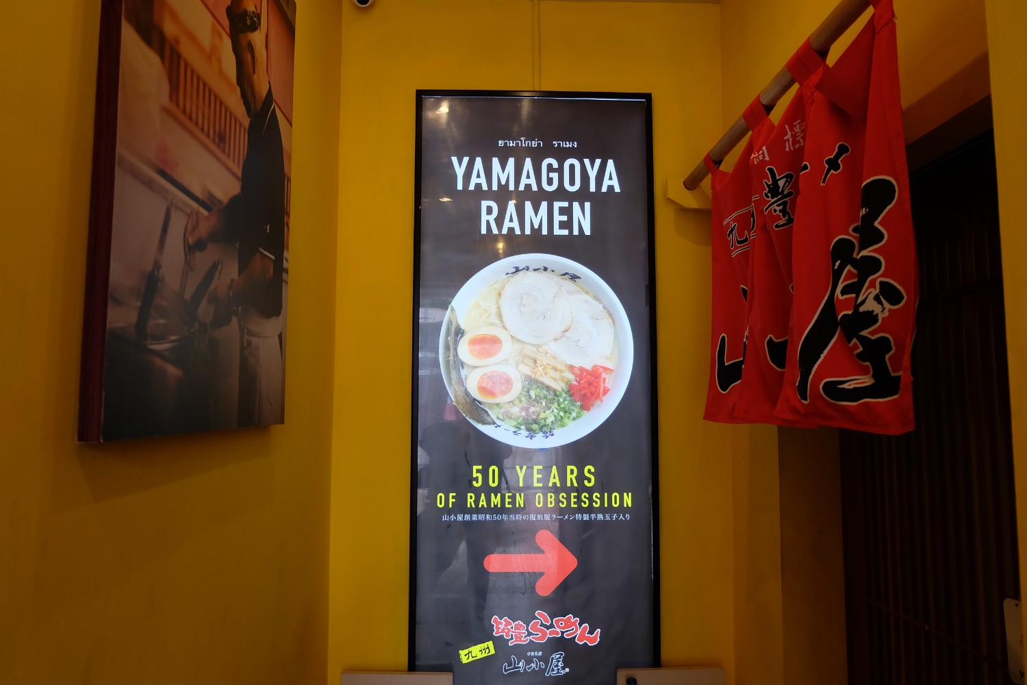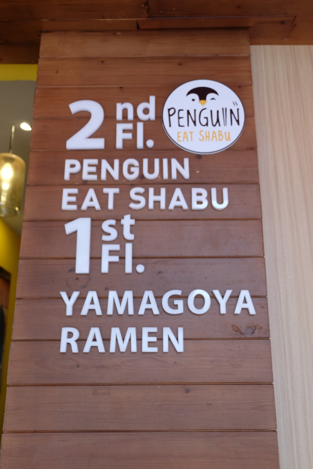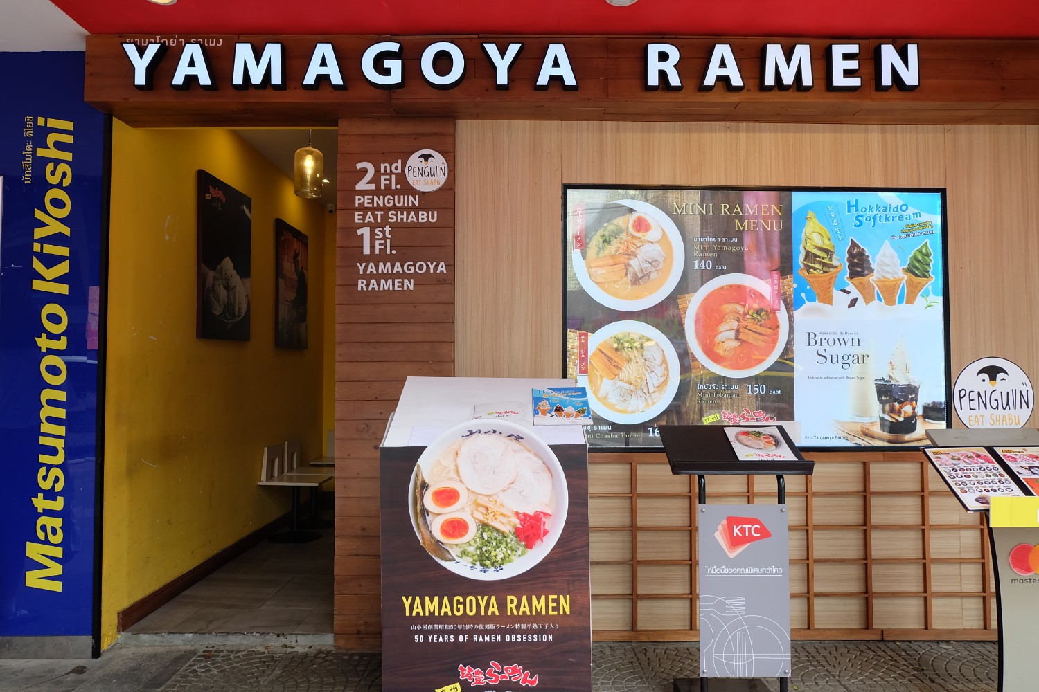 จุดสังเกตป้ายหน้าร้าน Yamagoya Ramen ขนาดใหญ่และมีร้าน Penguin Eat Shabu อยู่ชั้น 2