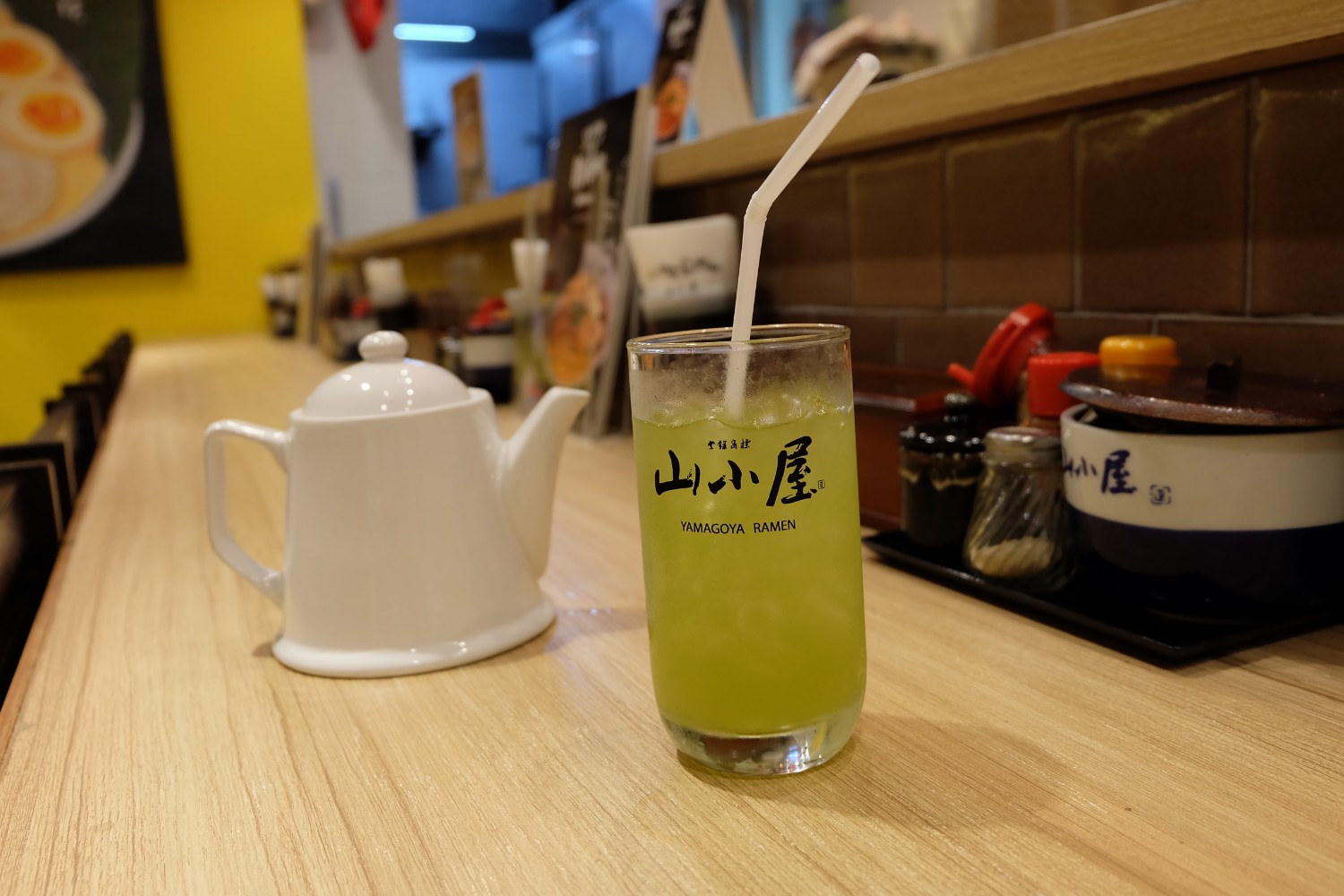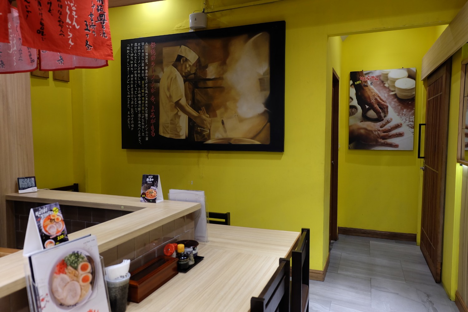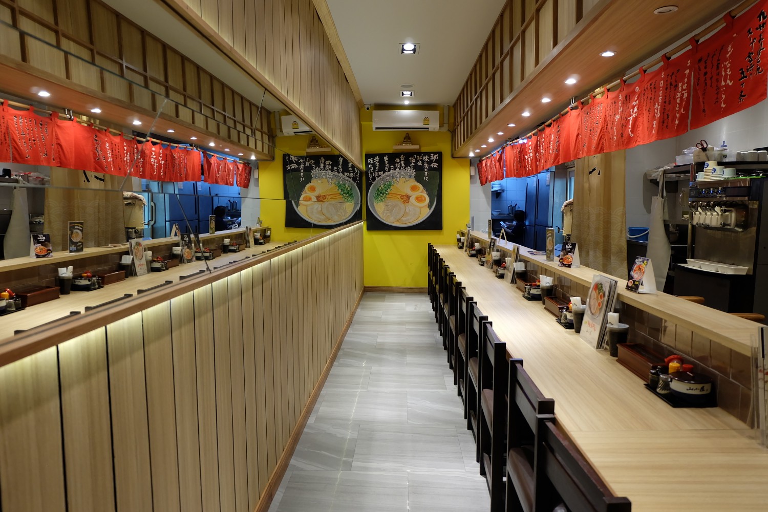 หน้าร้านตกแต่งด้วยบรรยากาศสไตล์ญี่ปุ่น ประตูทางเข้าเป็นประตูไม้บานเลื่อน เปิดเข้าไปคิดว่าอยู่ญี่ปุ่น ร้านตกแต่งให้อารมณ์แบบนั้นจริง ๆ เป็นที่นั่งเคาน์เตอร์บาร์ยาว ภายในร้านตกแต่งด้วยภาพ พร้อมกับธงญี่ปุ่น ดูเพลินดีค่ะ