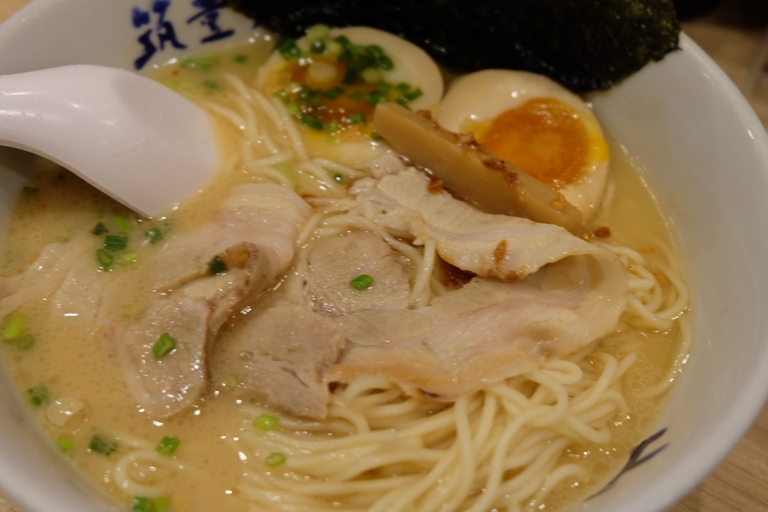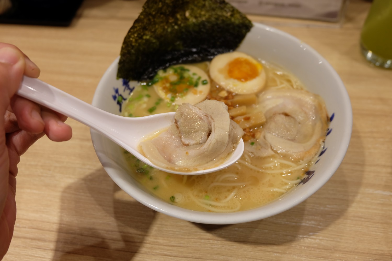 เสิร์ฟมาชามโตครบเครื่อง ด้วยซุปกระดูกหมูเข้มข้น ส่วนตัวชอบซุปของชามนี้เหมือนกัน คือ หอม เข้มข้นมาก เส้นเล็ก หนึบ ทำให้ทานเข้ากับตัวซุปมากขึ้น ส่วนหน่อไม้อร่อย รสชาติชัดเจน ตัวของหมูชาชูและไข่ จะเหมือนกับเมนูหม่าล่า ราเมน เมนูนี้แนะนำให้ลองเหมือนกันค่ะ เพราะเป็นซุปต้นตำรับของทางร้านเลย