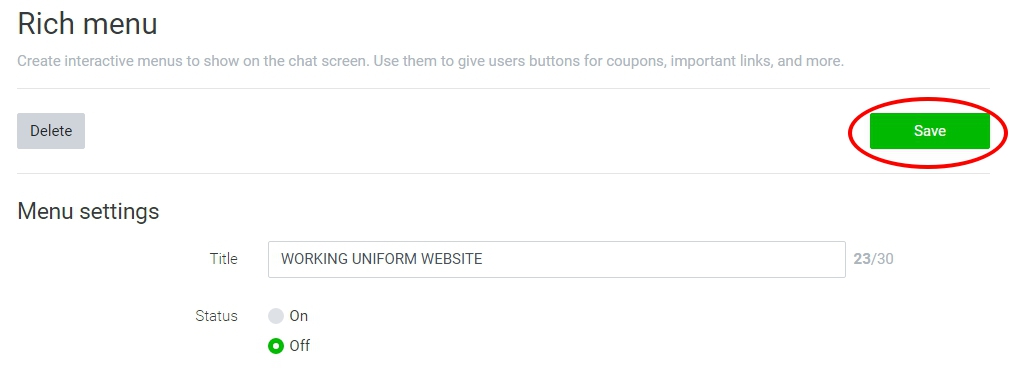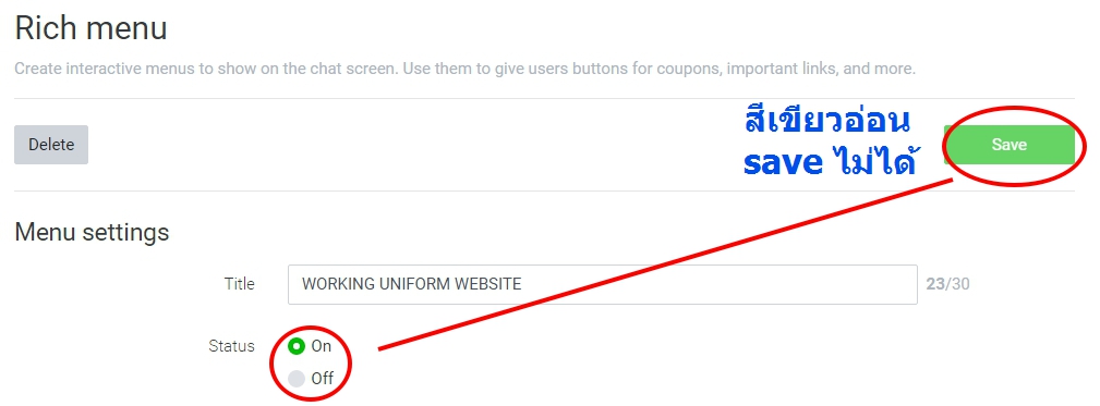 Rich Menu สร้างเสร็จแล้ว แต่ save ไม่ได้ ถ้าเลือก สถานะ เป็น ON ปุ่ม save จะ กดไม่ได้ ถ้าเลือก เป็น OFF มันจะ save ได้ แต่ไม่มีอะไรเกิดขึ้น ใน หน้า chat ให้เราเป็น rich menu ต้องไปทำอะไรเพิ่มเติม หรือ ไม่ครับ