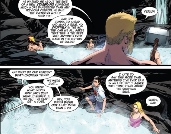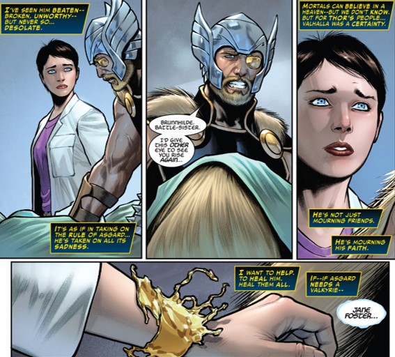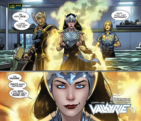 The War of the Realms: Omega (ตอนเดียวจบ) [Spoil] คลิกเพื่อดูข้อความที่ซ่อนไว้มันมีอยู่สามพาร์ท ขอพูดถึงพาร์ทเดียวละกัน ปรากฏว่าค้อนอัลติเมทโยเนียร์แท้จริงแล้วคือวัสดุอะไรก็ไม่รู้ที่ก๊อดดูมเอามาใช้ปั้นแต่งให้เป็นรูปร่างครึ่งค้อนครึ่งขวานแบบนั้น (มั้ง เดาเอา) ตอนนี้มันอยู่ในรูปกำไลข้อมือ มันสามารถแปลงเป็นอาวุธอะไรก็ได้ตามแต่เจนฟอสเตอร์จะต้องการ แต่จะเป็นอะไรดีล่ะ ในเมื่อธอร์ที่แท้ทรูกลับมาทำหน้าที่ของตัวเองโดยสมบูรณ์แล้ว เจนก็ไม่คิดจะเป็นธอร์อีก
