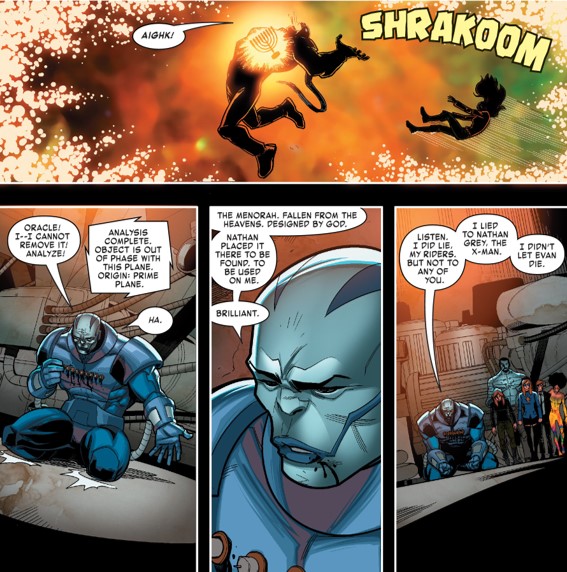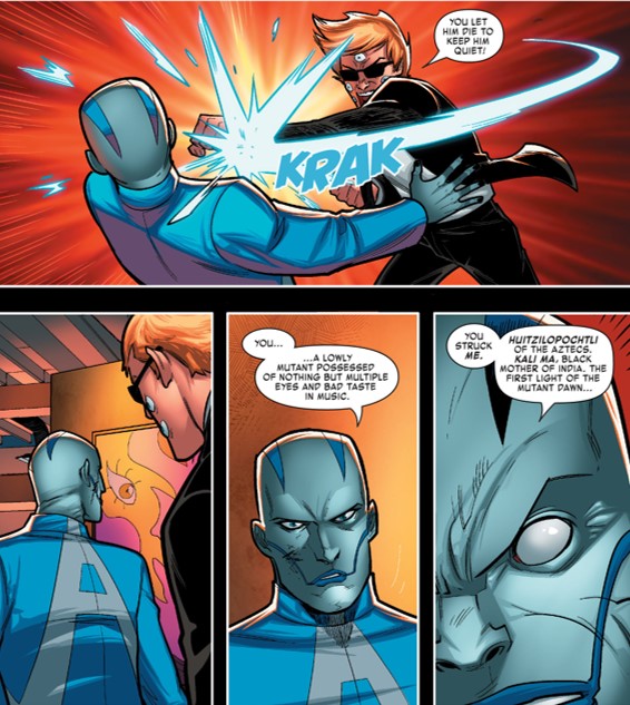 Age of X-Man: Apocalypse and the X-Tracts #5 (จบ) [Spoil] คลิกเพื่อดูข้อความที่ซ่อนไว้อาโพคาลิปส์เป็นคนประเภทน็อตหลุดง่าย พอโดนอายบอยต่อยหน้าก็ของขึ้น กลับสู่ร่างที่แท้จริงแล้วตบลูกทีมหงายเงิบ (สู้แบบโคตระมันส์เลยแหละ)