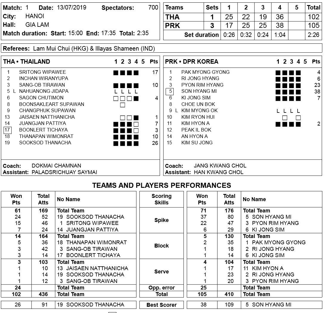🇹🇭 Thailand 🇹🇭 เพียว 27 แต้ม บุก 26/58 45% เสิร์ฟ 1 แต้ม บอลแรกperf 20% บีม 23 แต้ม บุก 23/58 40% แนน 15 แต้ม บุก 13/24 54% บล็อค 2 ออม 8 แต้ม บุก 6/17 35% บล็อค 2 บอลแรกperf 22% โบว์ 5 แต้ม บุก 5/6