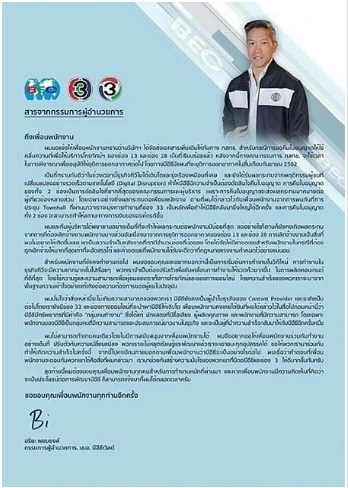 สำหรับพนักงานที่ยังคงทำงานต่อไป ผมขอขอบคุณและอยากบอกว่านี่เป็นการเริ่มต้นทำงานในวิถีใหม่ การทำงานในยุคที่ทีวีจะมีความยากมากขึ้นไปเรื่อยๆ พวกเราจำเป็นต้องใช้ความรู้และความสามารถเพื่อผู้ชมของเราทั้งทางโทรทัศน์และช่องทางออนไลน์ โดยความสำเร็จของพวกเราจะมาจากพื้นฐานความเข้าใจอย่างแท้จริงต่อความต้องการของผู้ชมในปัจจุบัน