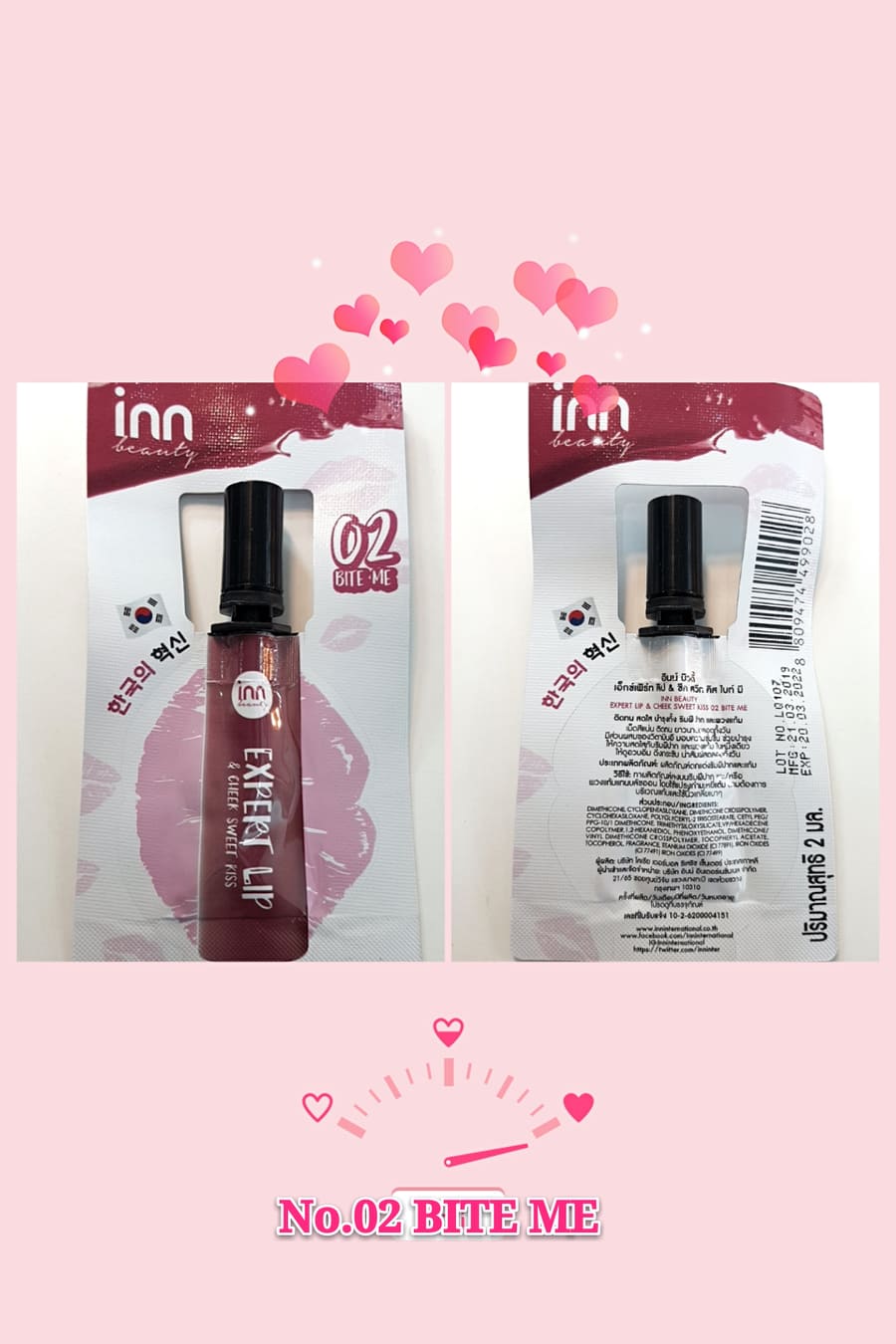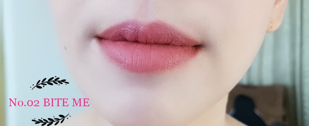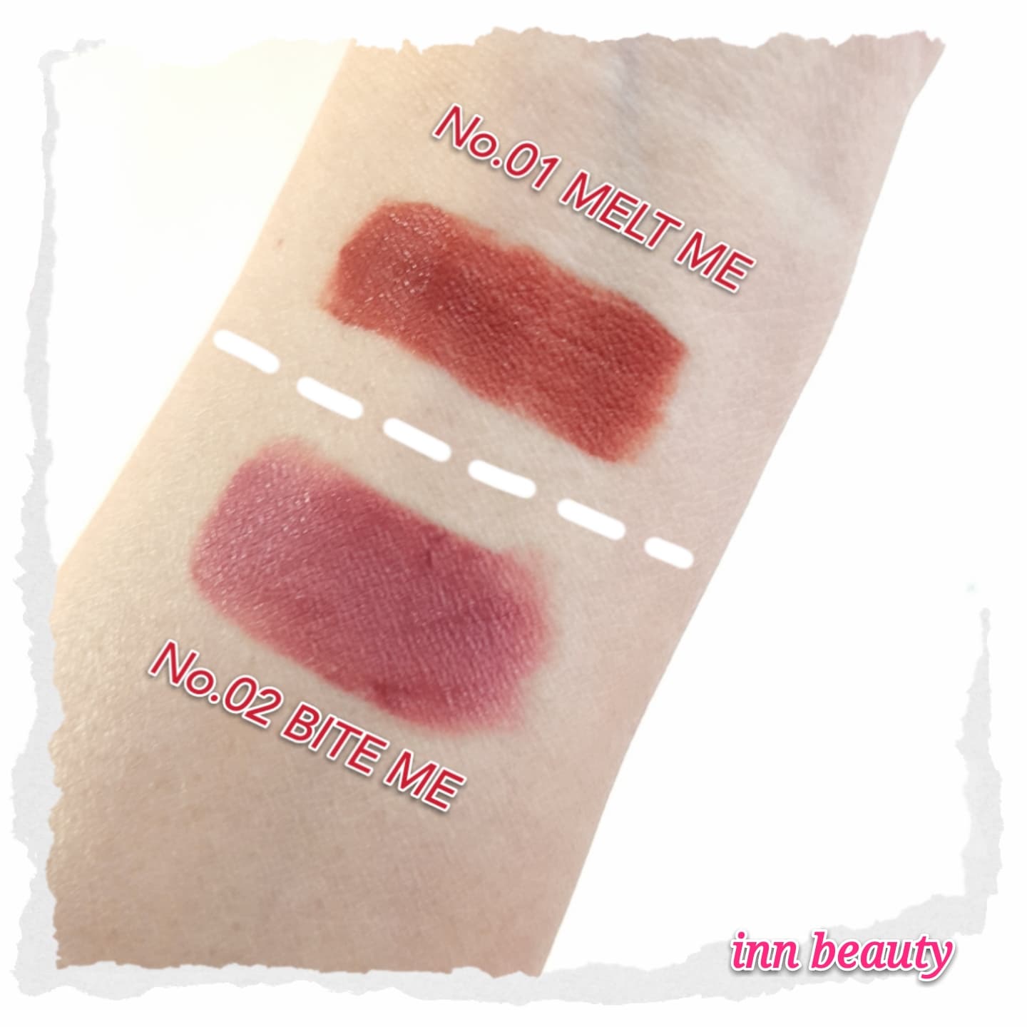 เบอร์ 02 ชื่อว่า BITE ME ราคาซองละ 49 บาท ทางแบรนด์เค้าเคลมไว้ว่า เม็ดสีแน่น ติดทน ยาวนานตลอดทั้งวัน และยังมีส่วนผสมของวิตามินอี มอบความชุ่มชื่น ช่วยบำรุงให้ความสดใสของริมฝีปาก และพวงแก้ม