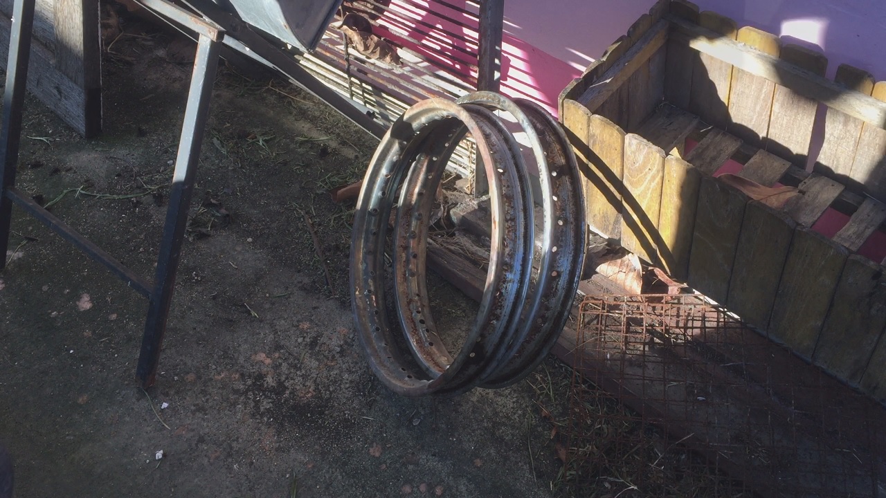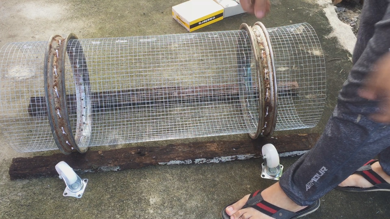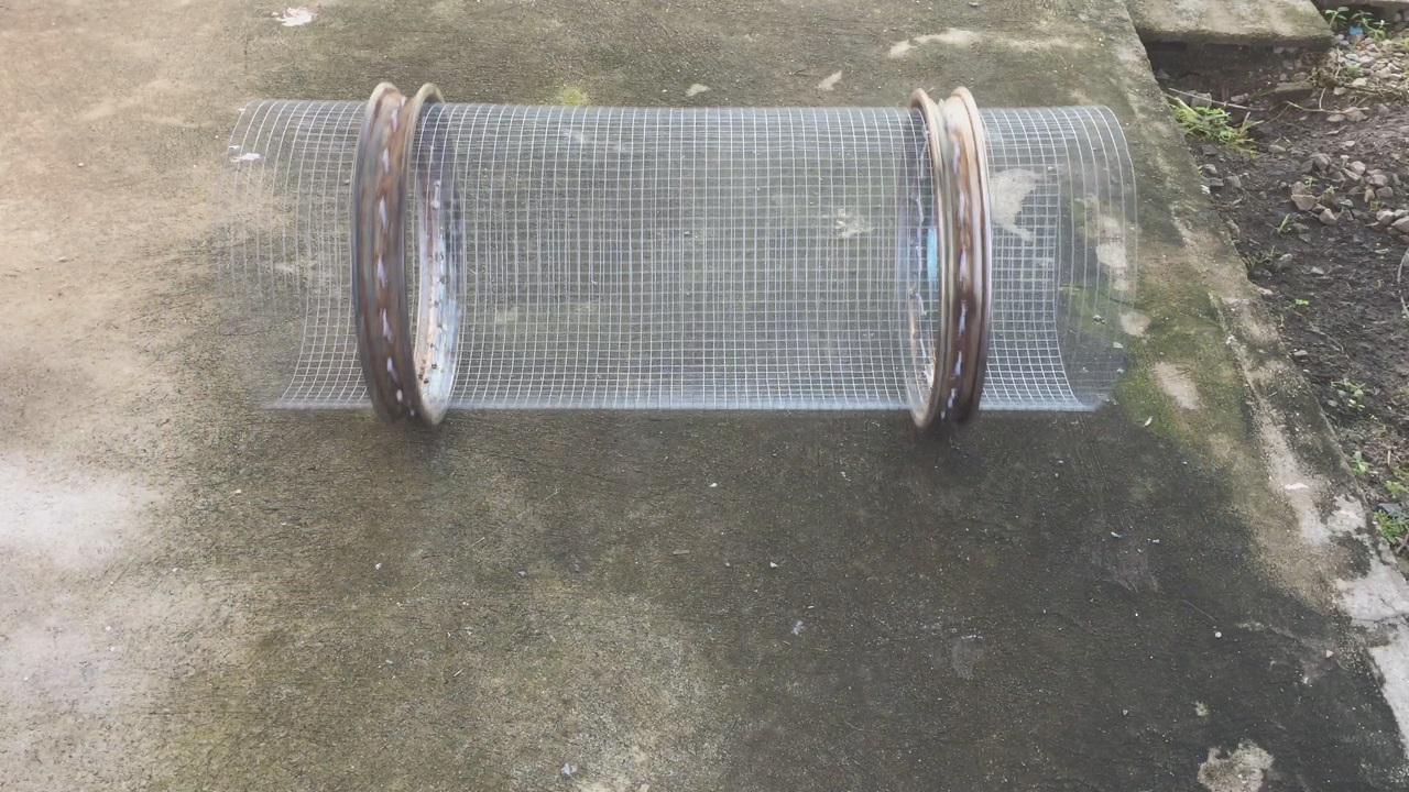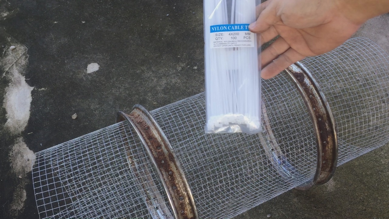 นำตาข่ายเหล็กมาตัดให้ได้ขนาดตามความยาวรอบวงของโครงล้อ แล้วม้วนใส่ด้านในให้เกินเกยซ้อนกัน