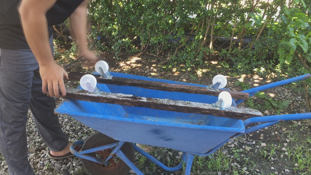 ตัดท่อนไม้ให้ได้ขนาด แล้วนำล้อมาเทียบดูตำเเหน่งให้ตรงกับโครงเครื่องร่อน แล้วเจาะยึด