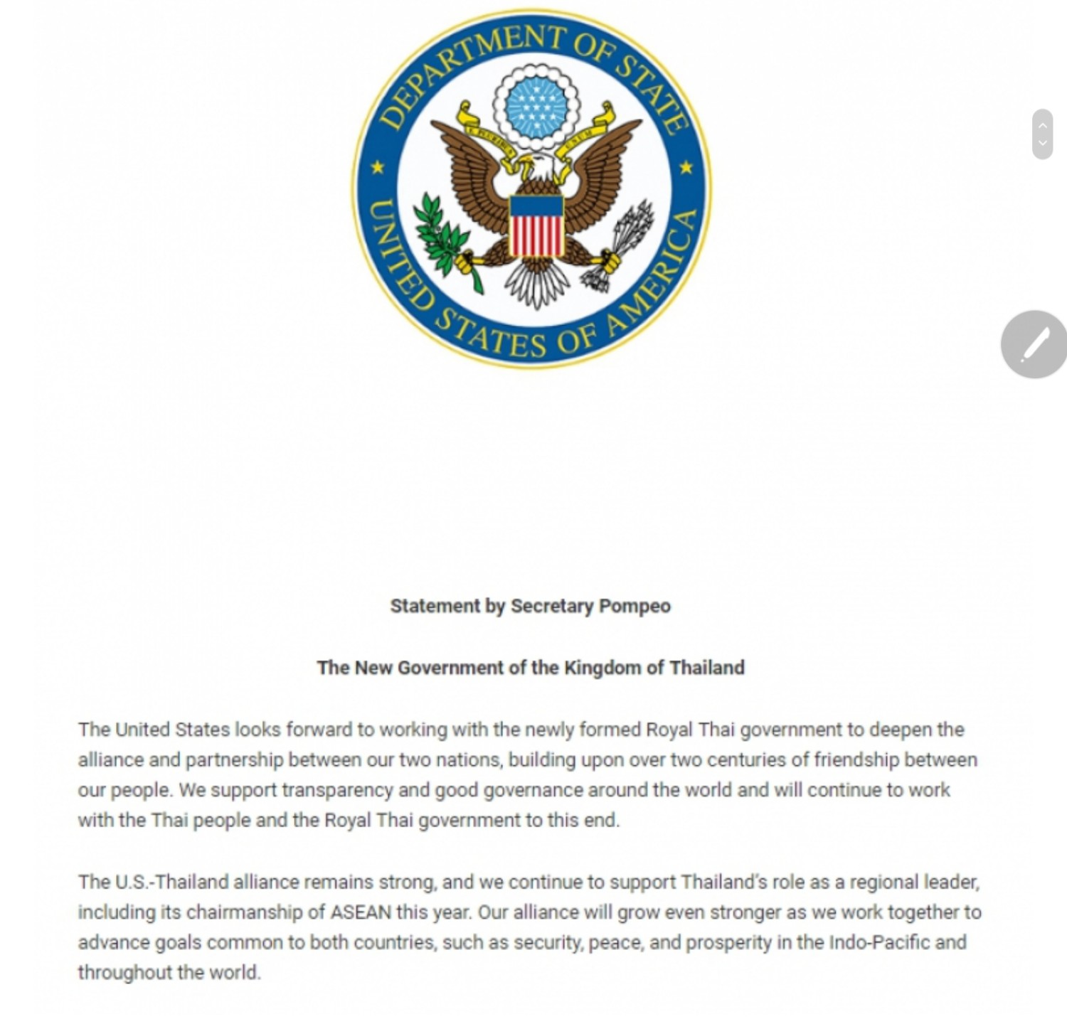 หลังจากเฟชบุ๊ก U.S. Embassy Bangkok ได้เผยแพร่สารของ ไมค์ ปอมเปโอ รมว.ต่างประเทศสหรัฐ แสดงความยินดีต่อรัฐบาลไทย โดยมีเนื้อหาระบุว่า สหรัฐอเมริกาตั้งตารอที่จะได้ร่วมงานกับรัฐบาลที่จัดตั้งขึ้นใหม่ของไทย เพื่อกระชับสัมพันธไมตรีและความร่วมมือระหว่างประเทศของเราทั้งสอง อันจะทำให้มิตรภาพกว่าสองร้อยปีระหว่างประชาชนของเราเจริญงอกงามต่อไป เราสนับสนุนความโปร่งใสและธรรมาภิบาลในทุกประเทศทั่วโลก และจะยังคงทำงานร่วมกับประชาชนชาวไทยและรัฐบาลไทยเพื่อให้บรรลุวัตถุประสงค์ดังกล่าว
