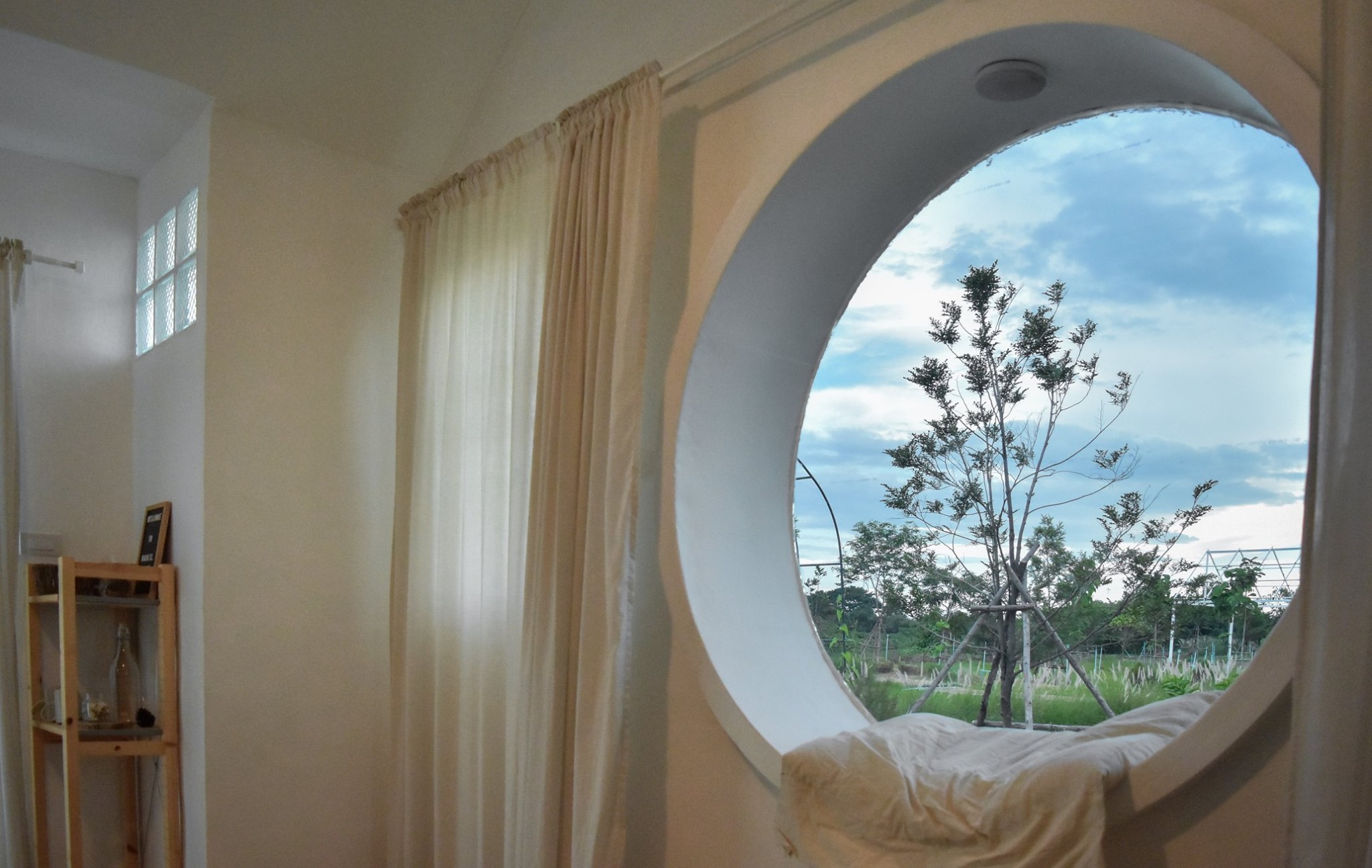 ภาพนี้เราถ่ายจากในบ้านนกนะคะ จุดเด่นของบ้านนกคือหน้าต่างวงกลมอันนี้นี่เองค่ะ ที่มองออกไปจะเห็นวิวข้างนอก ทั้งวิวแปลงผัก ท้องฟ้า ดอกหญ้า ครบเลยยยย