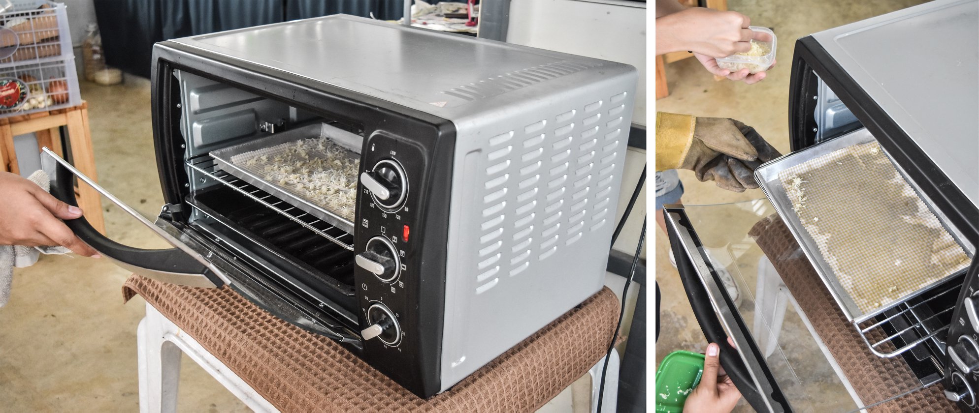 พอเราขูดไขผึ้งแล้วโรยลงบนผ้าแล้ว เราก็นำเข้าไมโครเวฟค่า ปล่อยให้มันละลายลงบนผ้า ถ้าไม่ทั่วก็เติมไขผึ้งอีกได้นะคะ ไม่ต้องซีเรียส พอะลายเสร็จแล้วก็หยิบออกมาตากพัดลมแปปเดียวค่ะมันก็จะเริ่มแห้งและแข็ง แต่ตอนตากพัดลมระวังอย่าให้ผ้าพับซ้อนกันนะคะ แค่นี้ง่ายๆก็เสร็จแล้ว เวลาใช้ก็เอามาห่อแล้วบิดตรงหัวท้าย พอไขผึ้งได้รับความร้อนจากมือเราก็จะทำให้ผ้าติดกันได้เหมือนการซีลเลยค่า