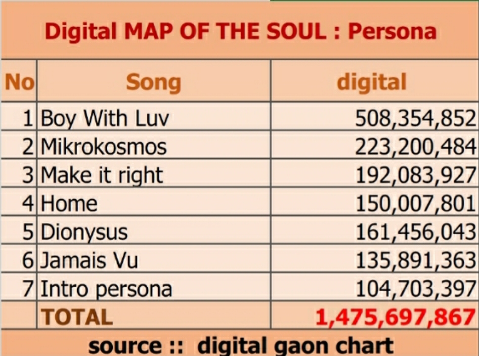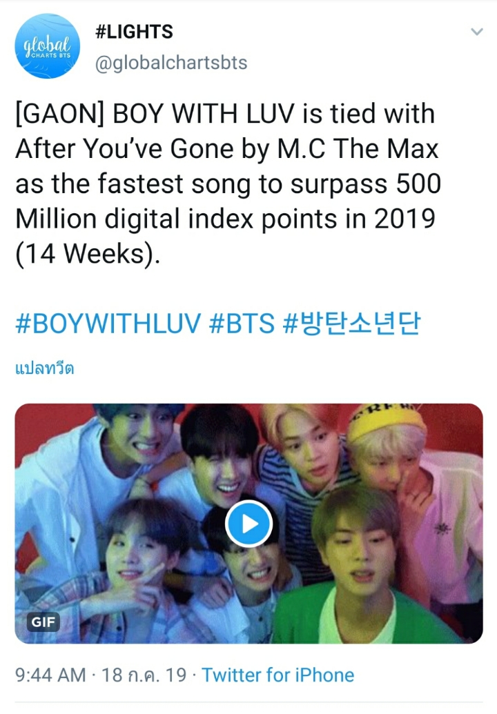 หลังจากยอดดิจิตอลรายสัปดาห์โดย gaon ออกมาสัปดาห์นี้ ส่งผลให้เพลง Boy With Luv feat.halsey มียอดดิจิตอลเข้าสู่ 500 ล้านเรียบร้อยแล้ว โดยใช้เวลาเพียง 14สัปดาห์เท่านั้น