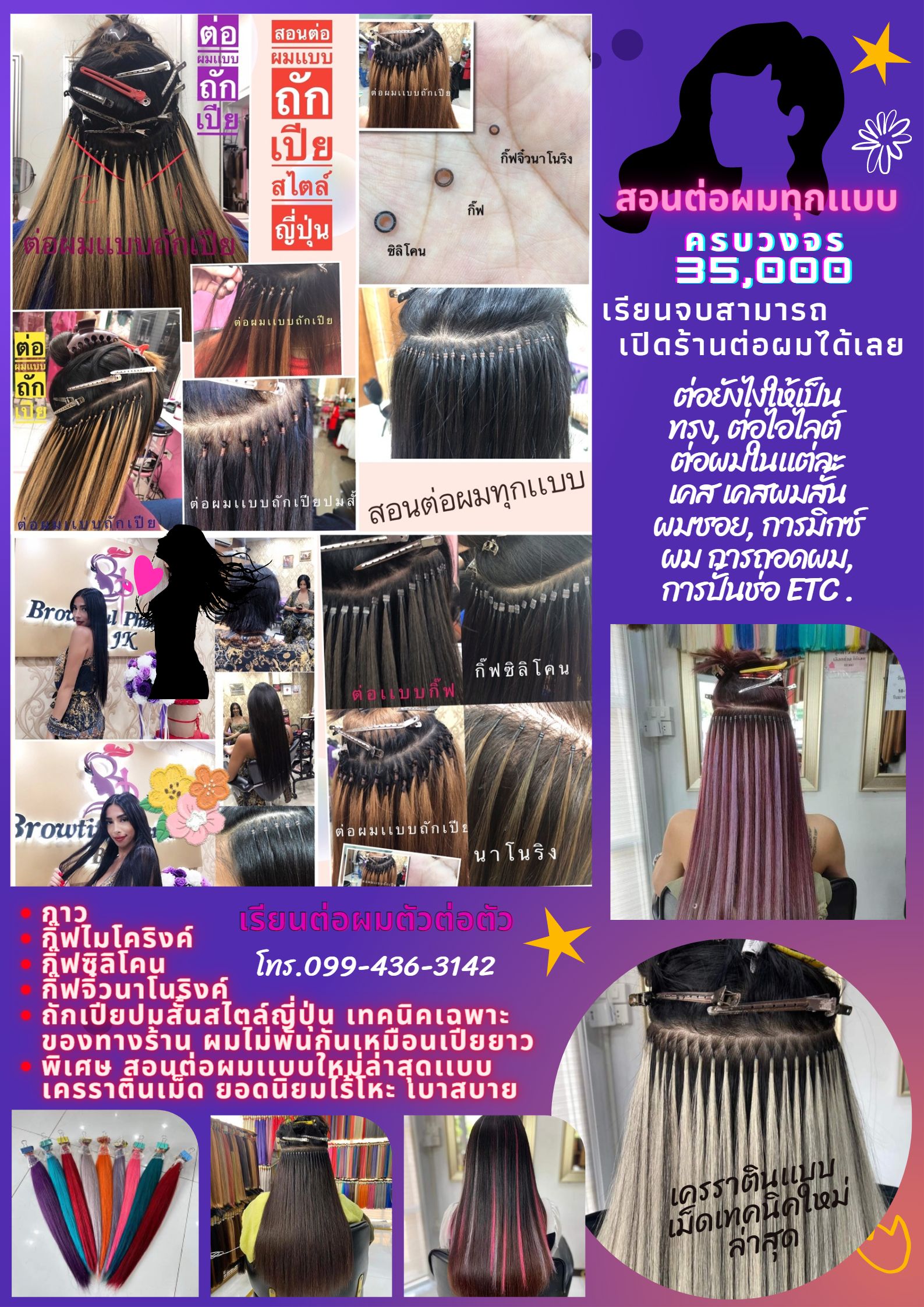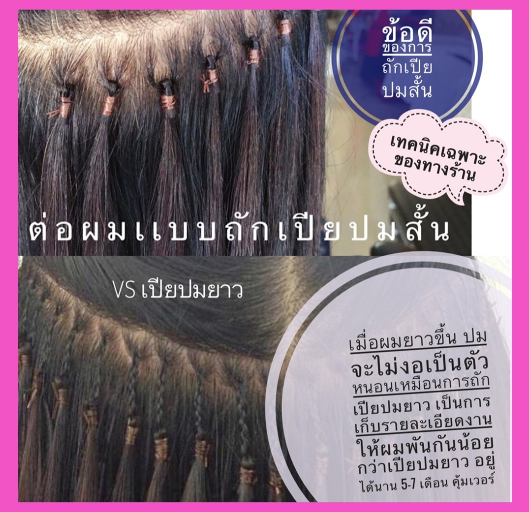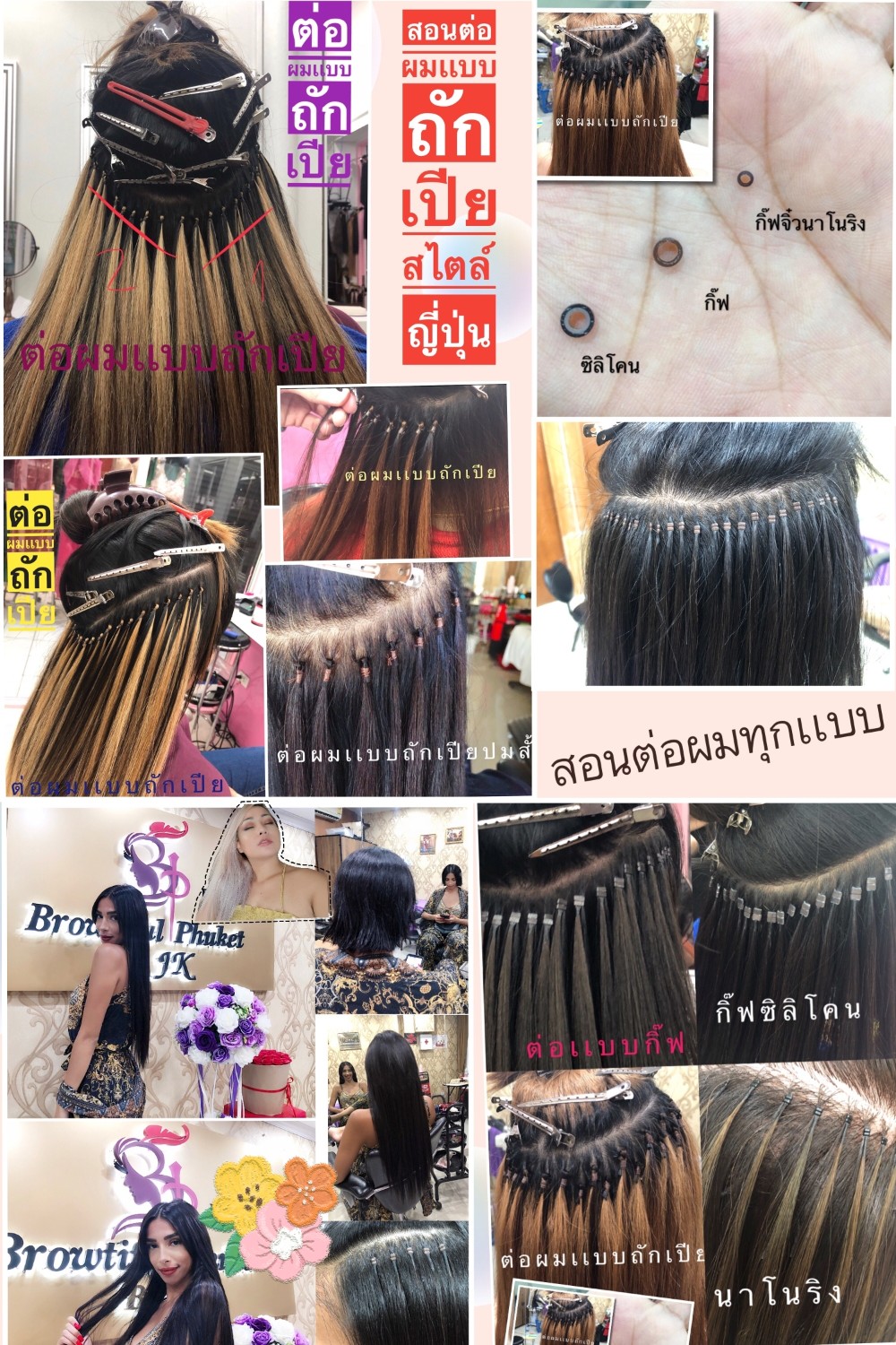เรียนต่อผมแบบ 6 เเบบ กาว/กิ๊ฟไมโครริงค์/กิ๊ฟซิลิโคน/กิ๊ฟจิ๋วนาโนริงค์/ถักเปียปมสั้นสไตล์ญี่ปุ่น เทคนิคเฉพาะของทางร้าน โดยการใช้ไหมญี่ปุ่นในการมัด เบาสบายหัวไร้โลหะกวนใจ เมื่อผมยาวขึ้นปมจะไม่หยิกงอเป็นตัวหนอนเหมือนการถักเปียปมยาวทั่วๆไป ข้อดีของการการถักเปียปมสั้นคือ ทำให้ผมพันกันน้อยกว่าการถักเปียปมยาว ที่เเรกในภูเก็ต เเละพิเศษเเบบใหม่ล่าสุดสอนต่อผมเเบบ เครราตินเม็ด ไร้โลหะ เบาสบายหัว ยอดนิยม