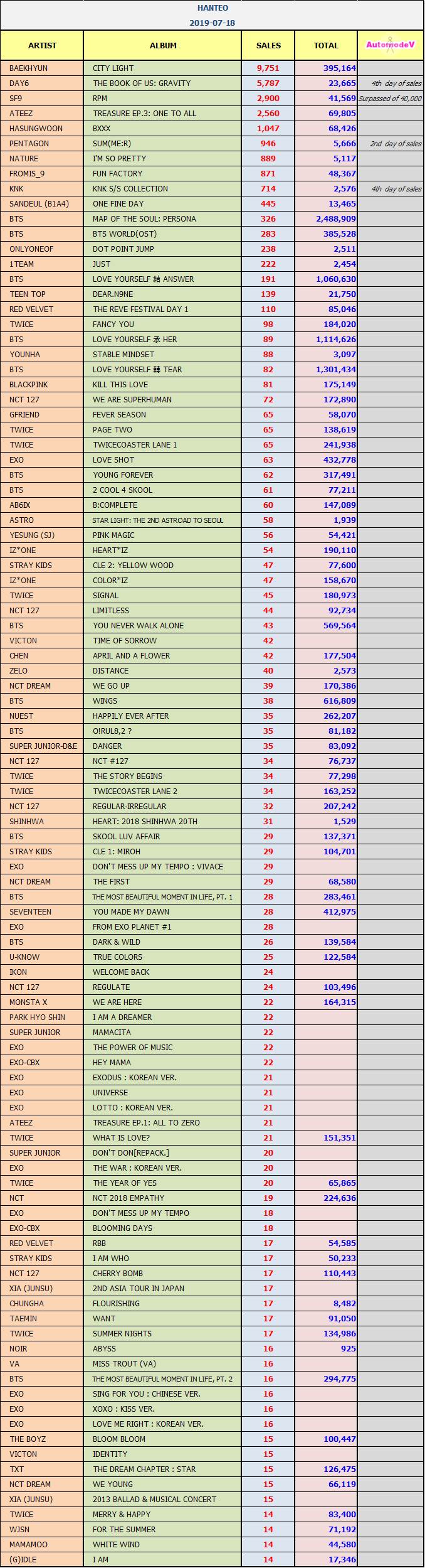 ยอดซื้ออัลบั้มจากชาร์ต HANTEO 18 กรกฎาคม 2562