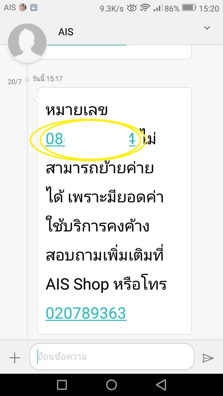 ค่ายเดิมคือ ais ครบกำหนดตัดยอดการใช้งานเมื่อคืน 19 กค 62 วันนี้ 20 กค 62 ทำการย้ายค่าย ด้วยการกดหมายเลข *151ตามด้วยหมายเลขบัตรประชาชน ฯลฯ ทำตามขั้นตอน เพื่อรอรับ SMS ได้รับคำตอบคือ ย้ายไม่ได้เนื่องจากติดยอดค้างชำระ ซึ่งข้อเท็จจริงแล้ว จ่ายหมดแล้ว ข้อมูลมือถือก็พยายามไม่ใช้ ใช้ wifi ของที่ทำงานแทน คือพยายามให้มียอดคงค้างน้อยที่สุด
