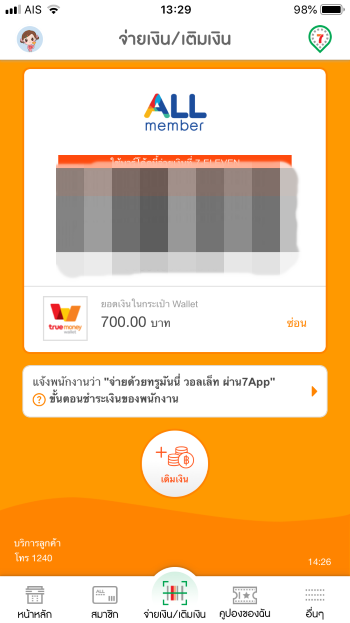 ใน True wallet ผมมีเงินอยู่ 700 บาท ทำไมยอดบน All member ไม่มีโชว์ครับ หรือไปถึง 7-11 พนักงานจะบอกเองหรือยังไงงงอยู่ตอนนี้
