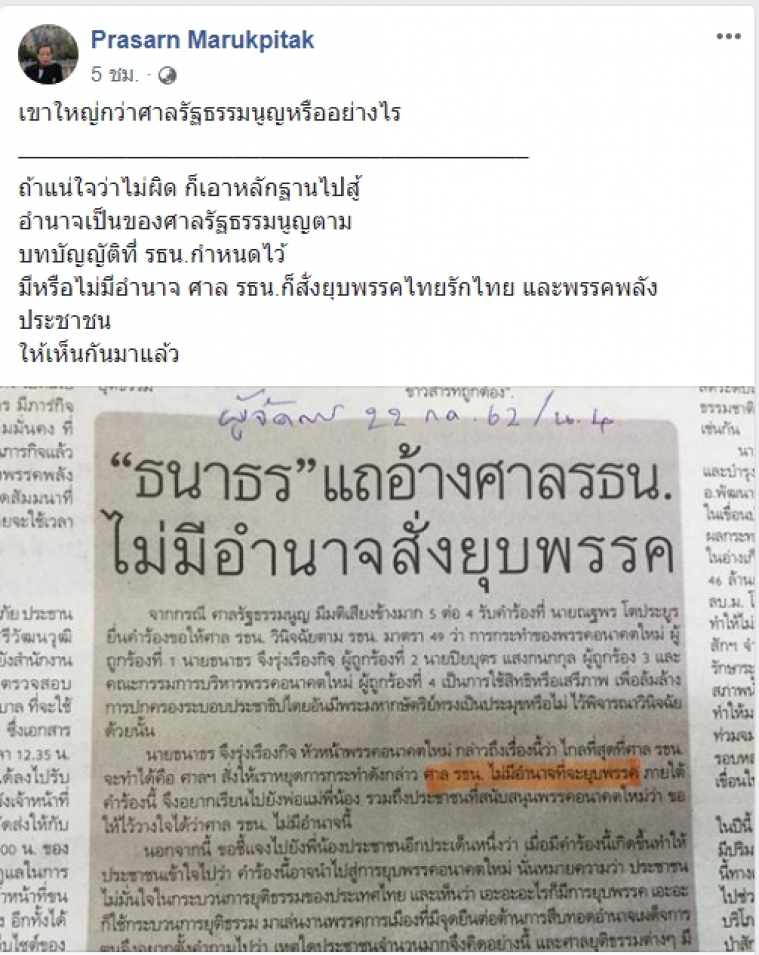 22 ก.ค.62 - นายประสาร มฤคพิทักษ์ อดีตสมาชิกวุฒิสภา(ส.ว.) โพสต์ข้อความลงในเฟซบุ๊ก ระบุว่า เขาใหญ่กว่าศาลรัฐธรรมนูญหรืออย่างไร