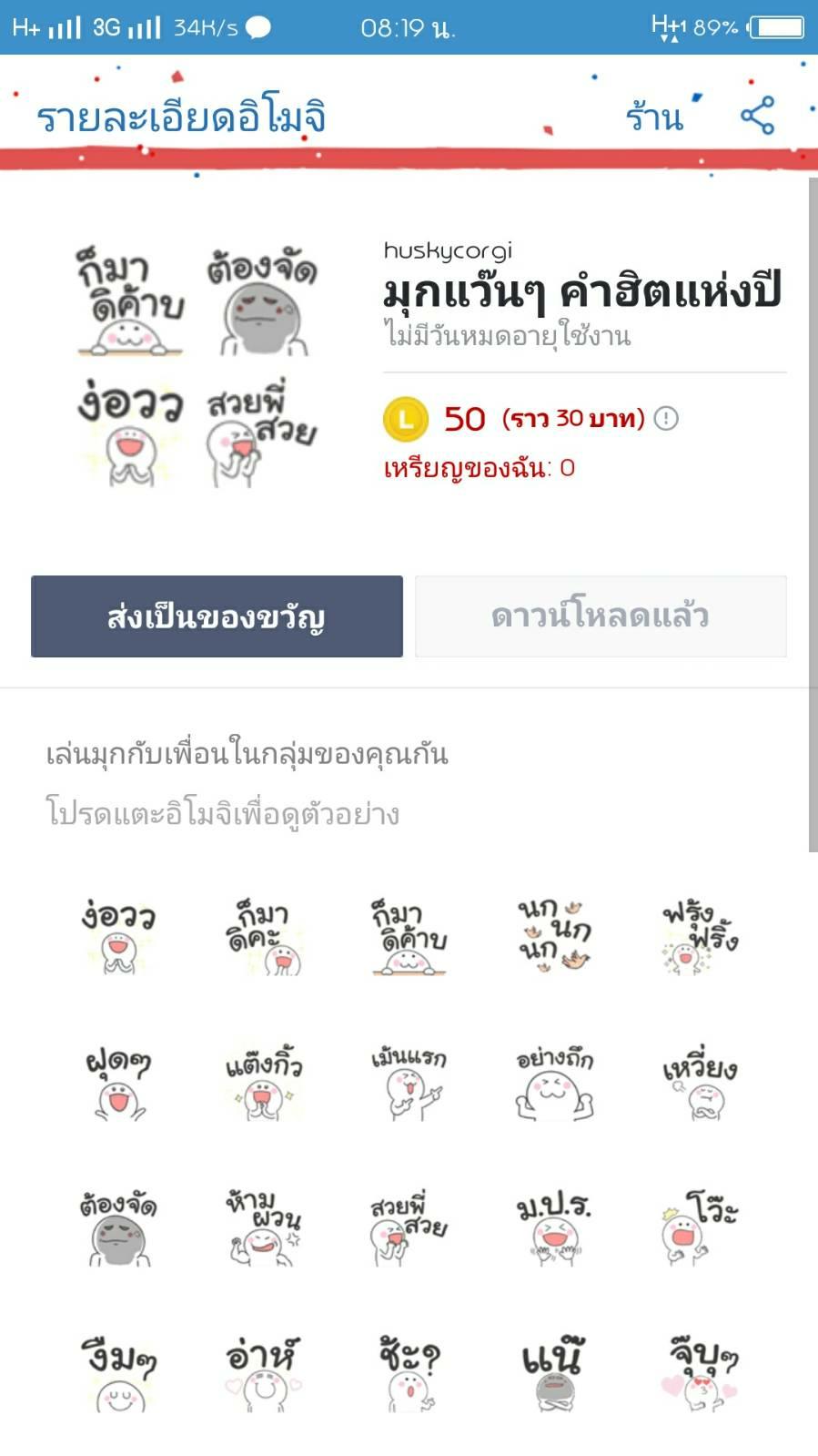 มองไม่เห็นทุกสติกเกอร์เลยค่ะ กดส่งสติกเกอร์ไม่ได้ แต่ถ้าเข้าไปโหลดหรือซื้อสติ๊กเกอร์เห็นค่ะ พอโหลดมาเป็นของตัวเองก็จะเป็นอย่างในรูป ใช้ไม่ได้ กดส่งอีโมจิได้ แต่ถ้ากดส่งตัวเดียวไม่ขึ้น ส่งอีโมจิมากกว่