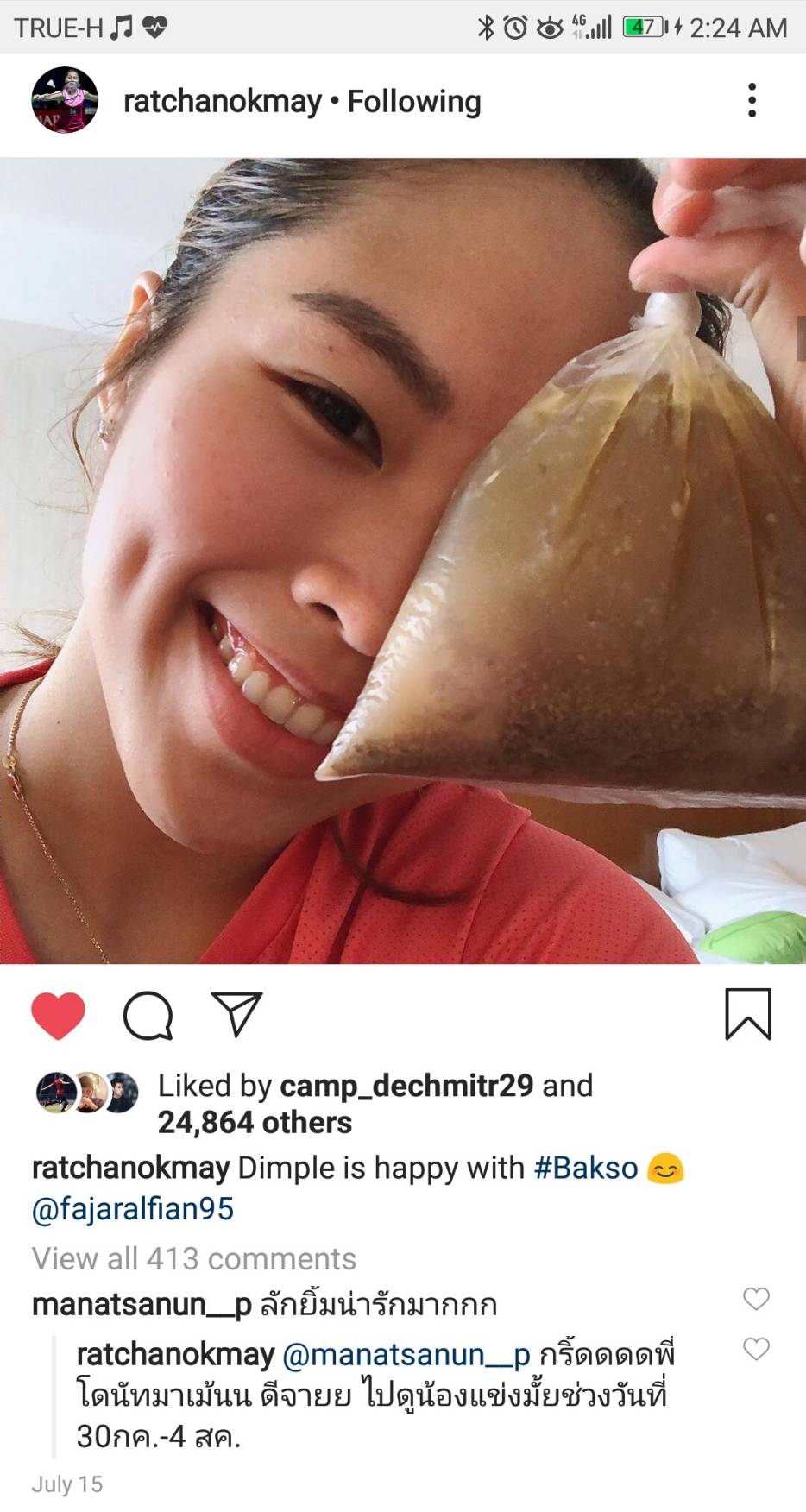 "Dimple is happy with #Bakso" และได้แท็ก Fajar Alfian นักแบดชายคู่อินโดนีเซียด้วย