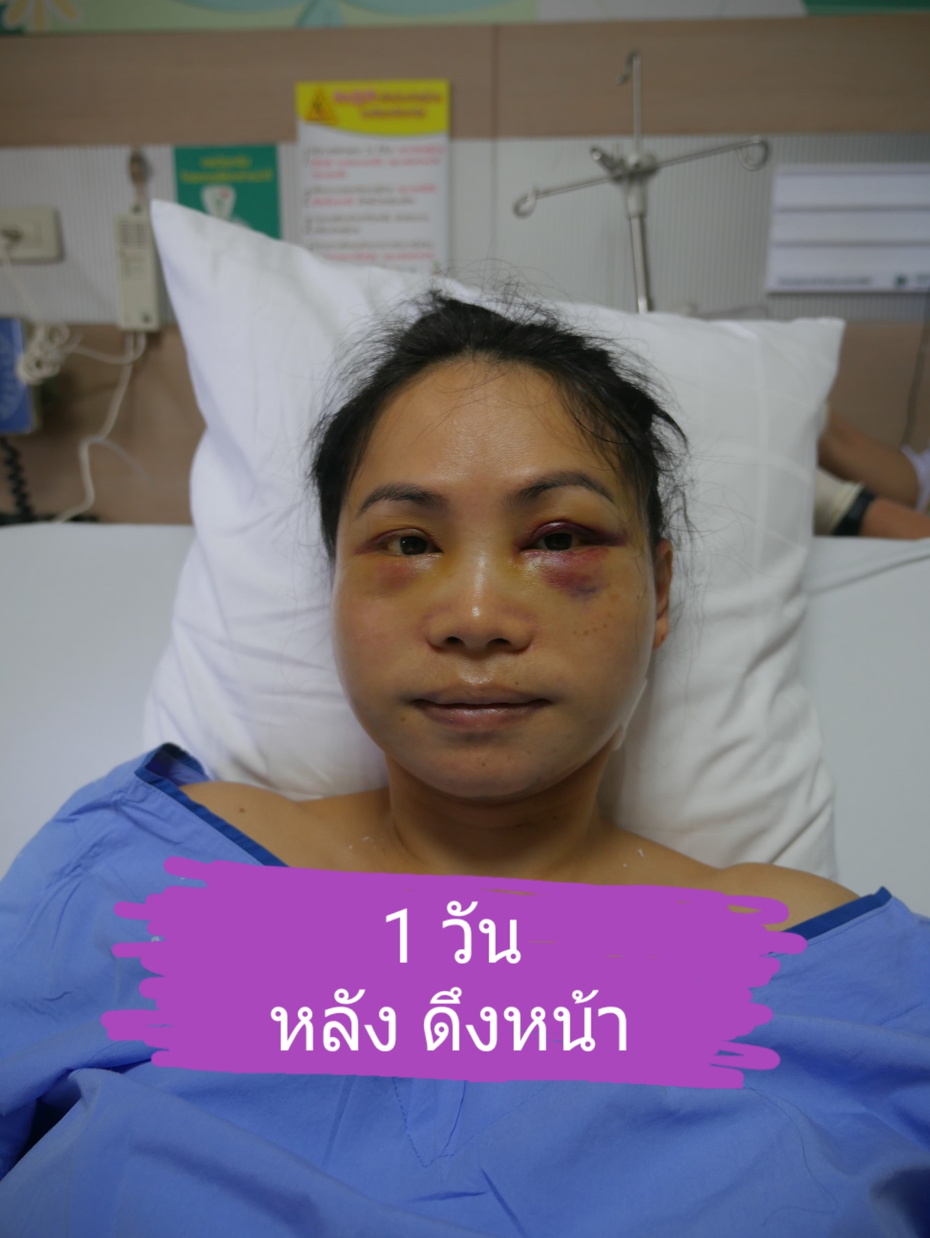 รูปหลังดึงหน้า 1 วัน คุณหมอได้มาเอาสายระบายเลือดออก ใบหน้าบวม มีระบมนิดหน่อย