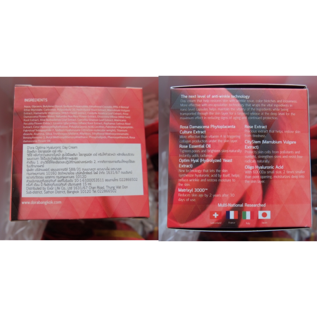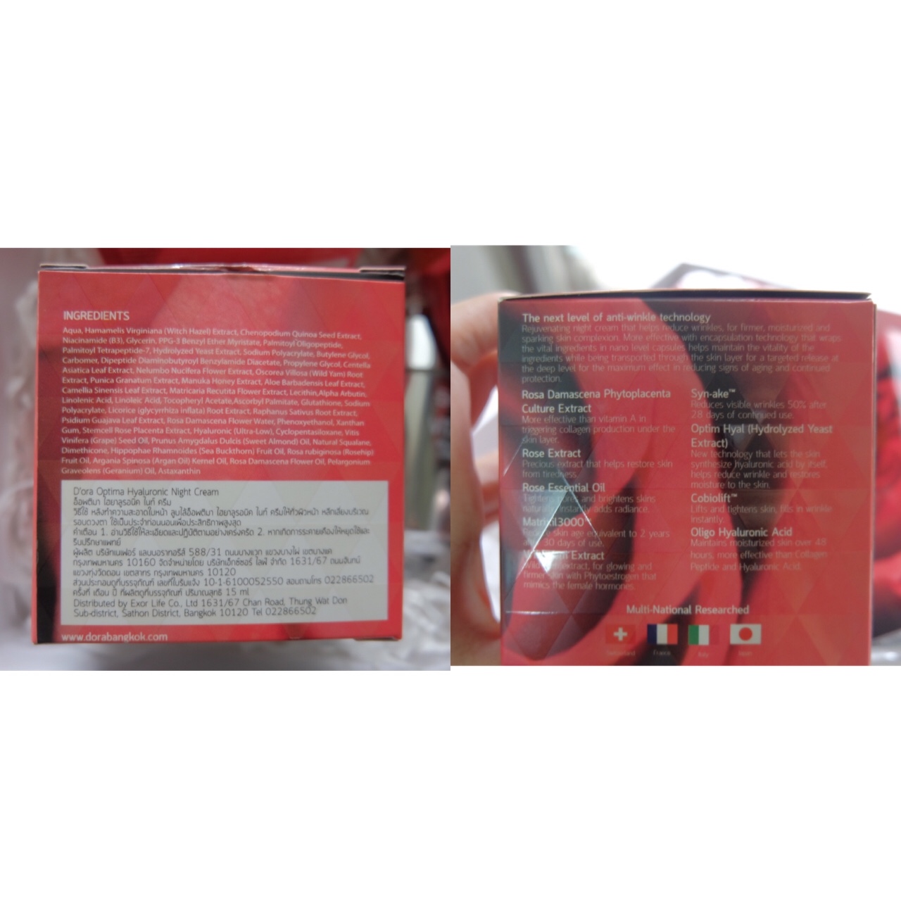 เป็นครีมที่ช่วยปกป้องและฟื้นฟูผิวยาวนานตลอดเวลาที่คุณหลับไหลยามค่ำคืน ด้วย D’ora Optima Hyaluronic Night Creamขนาด 15 ml ซึ่งตัวนี้มีส่วนผสมมีประสิทธิภาพในการกระตุ้นสร้างคอลลาเจนใต้ชั้นผิวดีกว่าวิตามิน A ลดอายุผิวลง 2 ปี เมื่อใช้ต่อเนื่อง 30 วันจากส่วนผสมที่มีชื่อว่า Matrixil3000 TM และยังสามารถลดเลือนริ้วรอยที่เห็นได้ชัดถึง 50% เมื่อใช้ต่อเนื่อง 28 วัน
