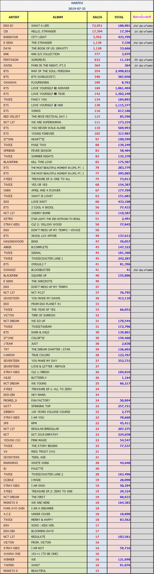 ยอดซื้ออัลบั้มจากชาร์ต HANTEO 23 กรกฎาคม 2562