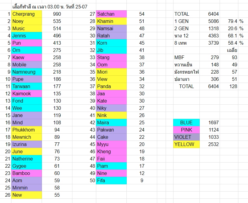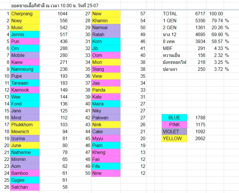 ยอดขายเสื้อกีฬาสี BNK48 ณ เวลา 03.00 น. วันที่ 25-07