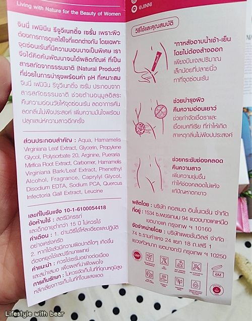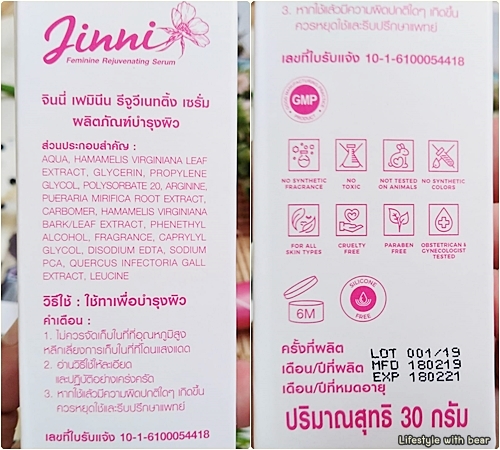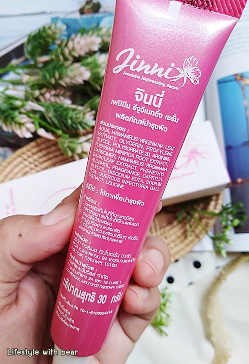 "Jinni Feminine Rejuvenating Serum" ขอเรียกง่ายๆ ว่าจินนี่เซรั่มแล้วกันนะ เราขออธิบายแบบให้เข้าใจง่ายๆ แล้วกันนะว่าผลิตภัณฑ์ตัวนี้เค้าคืออะไร….จินนี่เซรั่มนี้ก็เป็นเหมือนเซรั่มสำหรับน้องสาวเรานั่นเองเอาไว้ทาบำรุงและช่วยลดอาการคัน ตกขาว มีกลิ่นไม่พึงประสงค์ รวมไปถึงเรื่องการปรับสมดุลให้ผู้หญิงเพิ่มน้ำหล่อลื่นตามธรรมชาติด้วยล่ะ (ทาเซรั่มบำรุงผิวหน้ากันแล้วน้องสาวก็ต้องทาเน่อ ^^)