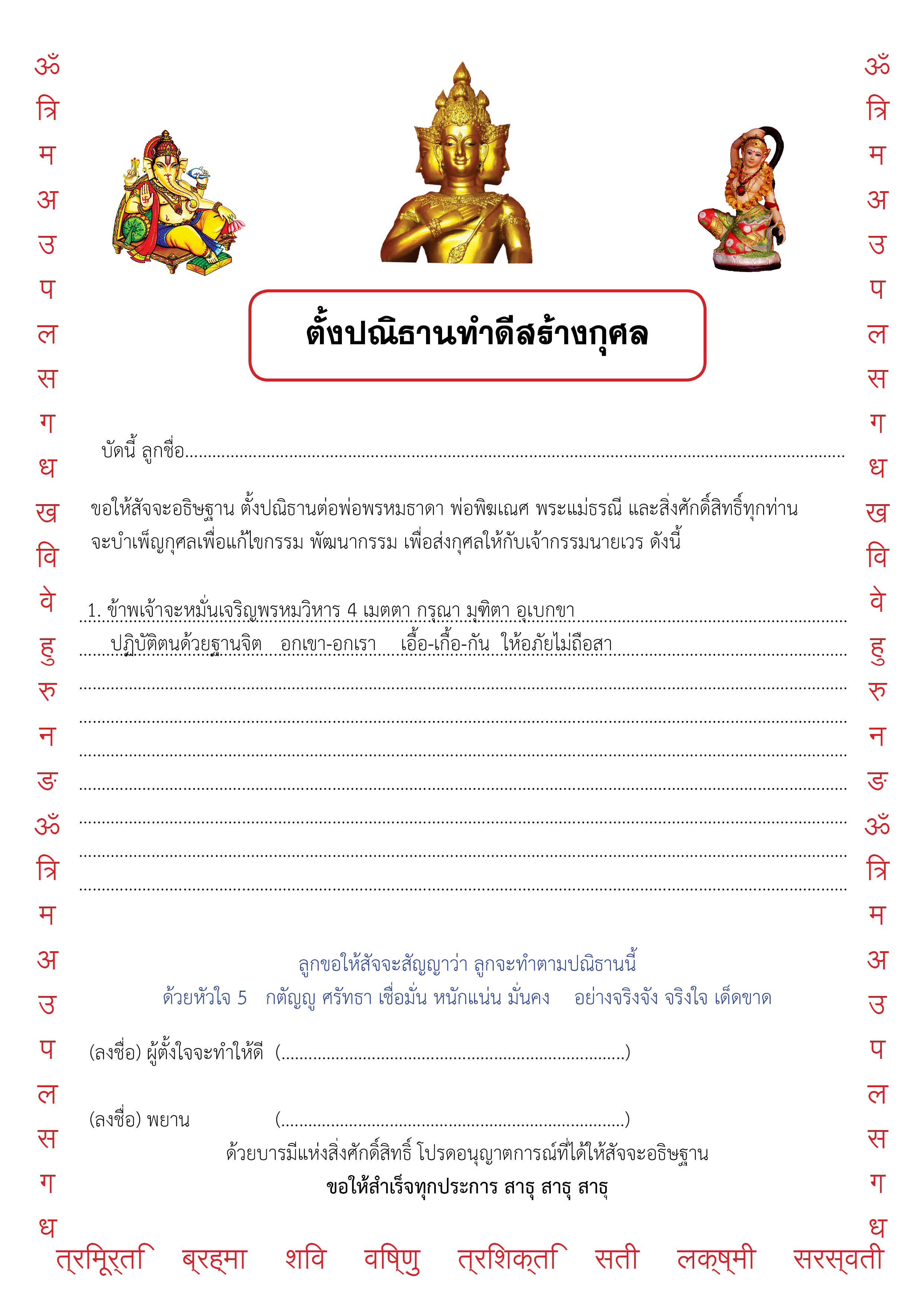 ด้วยบารมีแห่งสิ่งศักดิ์สิทธิ์ โปรดอนุญาตการณ์ที่ได้ให้สัจจะอธิษฐาน ขอให้สำเร็จทุกประการ สาธุ สาธุ สาธุ