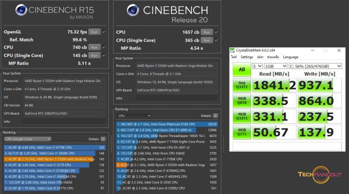CINEBENCH R20 / R15 นั้นเป็นการทดสอบการเรนเดอร์ CPU ล้วนๆแล้วและตัวใหม่ 20 นั้นทำงานหนักกว่าเดิมหลายเท่ามากๆ คือเป็นรุ่นใหม่ที่ทดสอบโหดกว่าเดิม Workload จัดหนักกว่าเดิมเยอะคะแนนนั้นทำไปได้ 1657 CB ครับในตัว Cinbench R20 ส่วนตัว R15 ตัวเก่านั้นทดสอบแล้วได้ที่ 75 Fps / 740 CB ถือว่าทำได้ต่ำกว่าตัว FX505DT เล็กน้อยเนื่องจากตัวนี้เป็น Ryzen 5 ด้วยนั้นเอง และตัวความร้อนหลังทดสอบตัวนี้ได้ที่ CPU 79 GPU 64 ส่วนทางด้าน SSD 512 GB PCLE นั้นทำการอ่านไปได้ที่ 1841.2 MB/s และเขียนที่ 937.1 MB/s ซึ่งถือว่าเร็วในระดับกลางๆตามราคาครับดีกว่า HDD แน่นอนแต่ก็อาจจะไม่ได้สุดเท่าพวกรุ่นแพงๆนั้นเอง เปิดปิด ลงโปรแกรมอะไรไวพอสมควรครับ ถ่ายโอนข้อมูลพวกนี้สบายๆและรองรับเพิ่ม HDD ได้อีกด้วยนั้นเอง