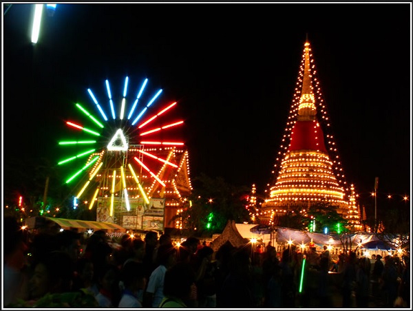 บริเวณวัดจึงสว่างไสวไปทั่วด้วยแสงไฟนีออนหลายหลากสี มีการจัดแต่งเป็นกลุ่มก้อนรูปทรงสวยงามแปลกตาจากที่เคยพบเห็น บางอันก็หมุนวน เคลื่อนไหวไปมาได้ ราวกับจะส่งเสียงกระซิบฝากมากับสายลมว่า "เชิญมาไว ๆ เชิญมาเที่ยวงานที่ได้ทั้งบุญกุศลและความสนุกสนาน"