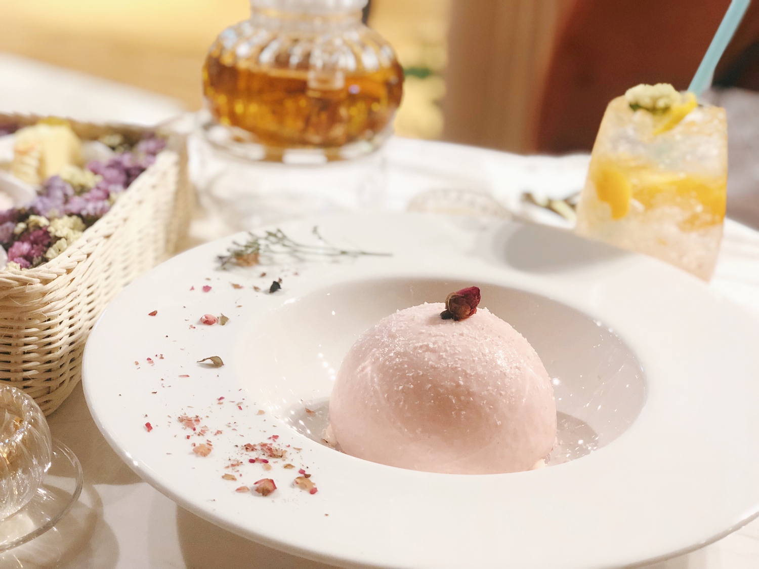 เสิร์ฟ เริ่มจาก Pre Dessert อย่าง สเฟียร์กุหลาบที่เป็นของเหลวในฟิล์มบางๆให้ความรู้สึกหวานละมุนและเแปลกใหม่