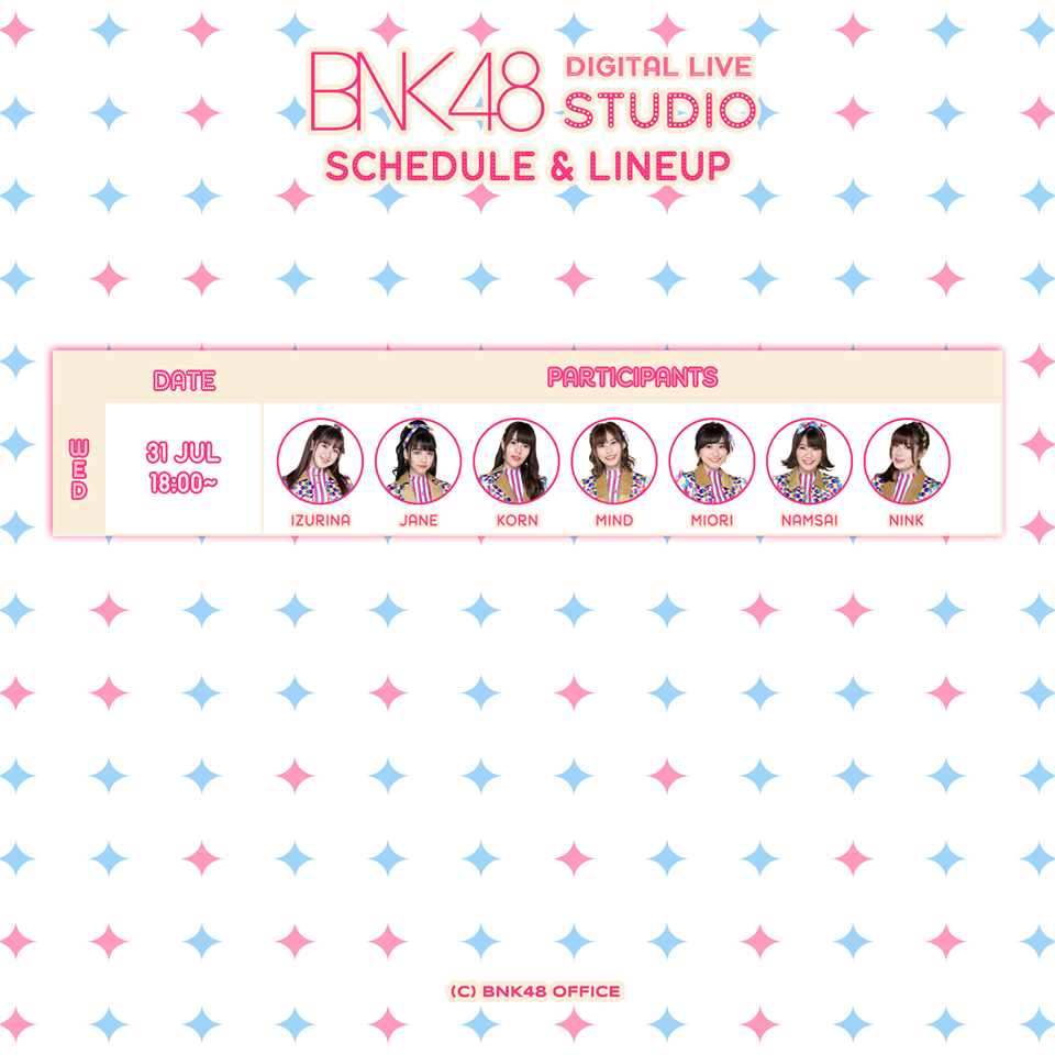 ประกาศ DIGITAL LIVE STUDIO ประจำวันที่ 18 กันยายน 2563 เวลา 18:00 น. ที่หน้าเพจ BNK48 OFFICIAL โดยมีสมาชิกที่เข้าร่วมดังนี้
