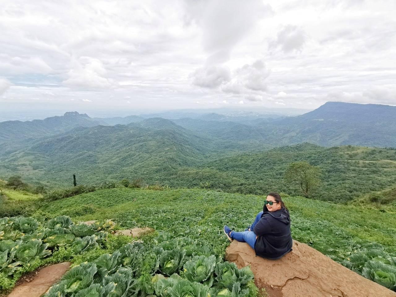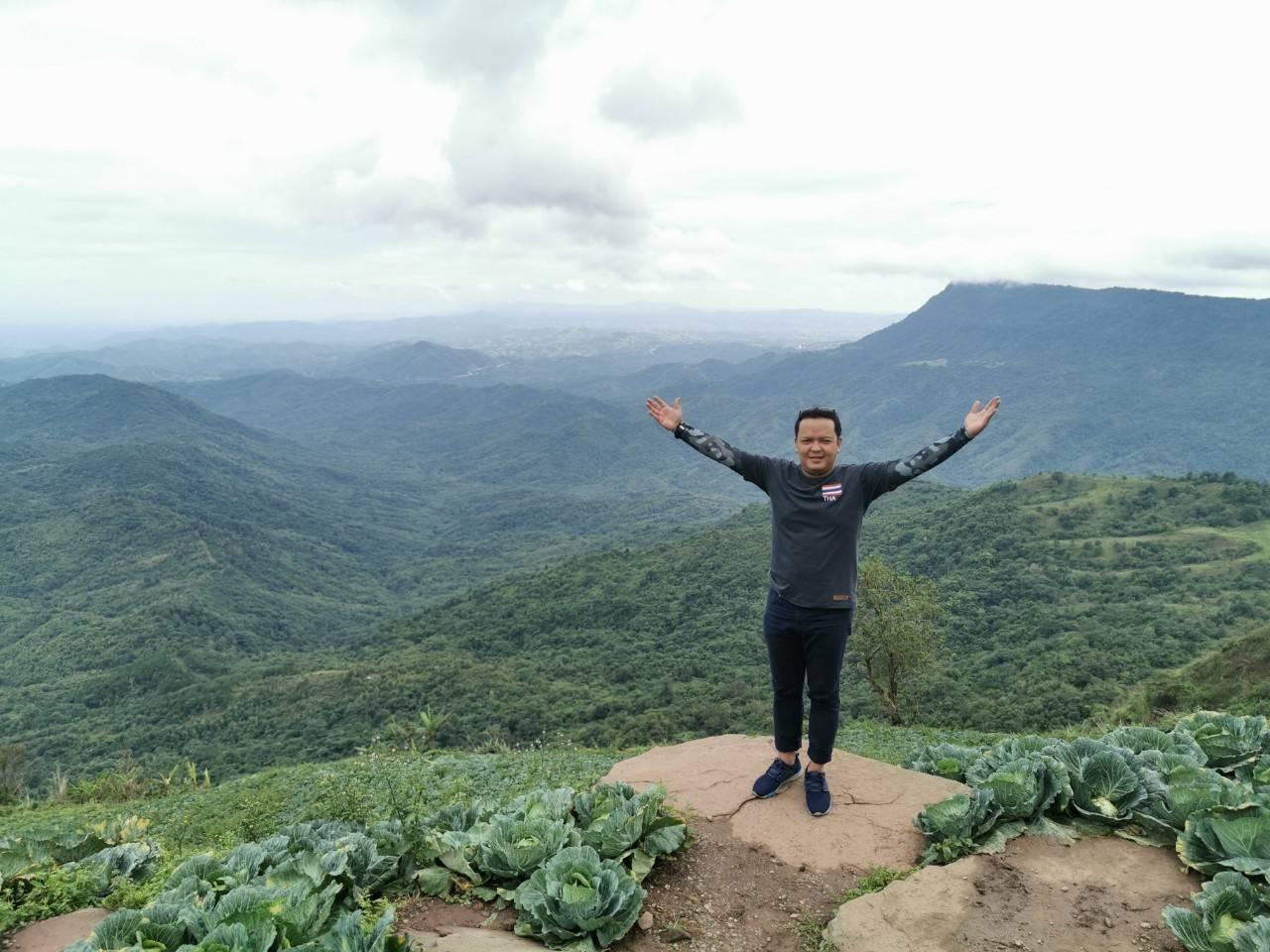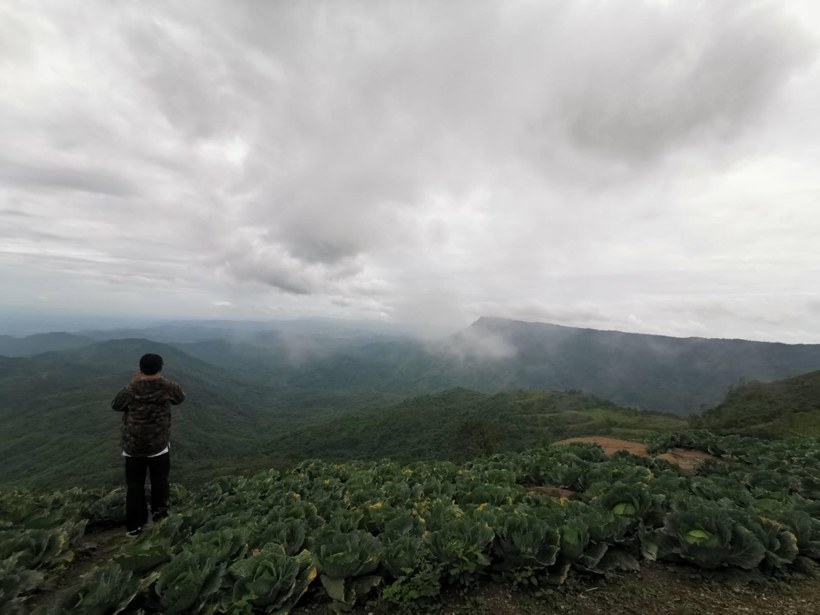 พออิ่มท้องก็มุ่งหน้าสู่ภูทับเบิกกันเลยจ้า 🛵💨💨 ทางขึ้นก็จะชันๆ โค้งเยอะๆ ถ้าตรงไหนเป็นโค้งอันตราย ต้องใช้ความระวัดระวังมาก เค้าจะมีธงแดงปักไว้ ให้เรารักษากฎให้ดีๆอย่างขับประมาทนะคะ เพราะอุบัติเหตุเกิดได้ง่ายมาก เราก็ขับมาเรื่อยๆ เจอวิวนี้ไม่จอดก็ไม่ได้ เพราะสวยมาก เห็นเป็นทุ่งดอกกะหล่ำปี แล้วเห็นทิวเขาอยู่ไกลๆ ความจริงตรงนี้ไม่ควรจอดนะคะหากเป็นรถใหญ่ จะเกิดอันตรายกับผู้อื่นได้ แต่เราเป็นรถมอเตอร์ไซค์เลยจอดแอบๆได้ 😁