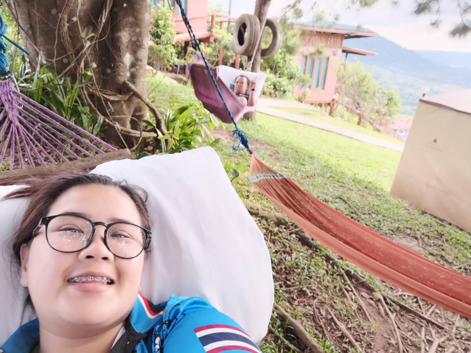 ถึงเวลาเข้าที่พักได้ เราเลยกลับมาที่โรงแรมแต่อยู่ในเต้นท์มันจะร้อน เพราะไม่มีแอร์ มีแต่พัดลม แถมแดดส่องอีกต่างหาก พอดีที่หลังเต้นท์มีเปลนอน ก็จัดสิคะรออะไร ลมเย็นอีกต่างหาก นอนเพลินกันเลยทีเดียว