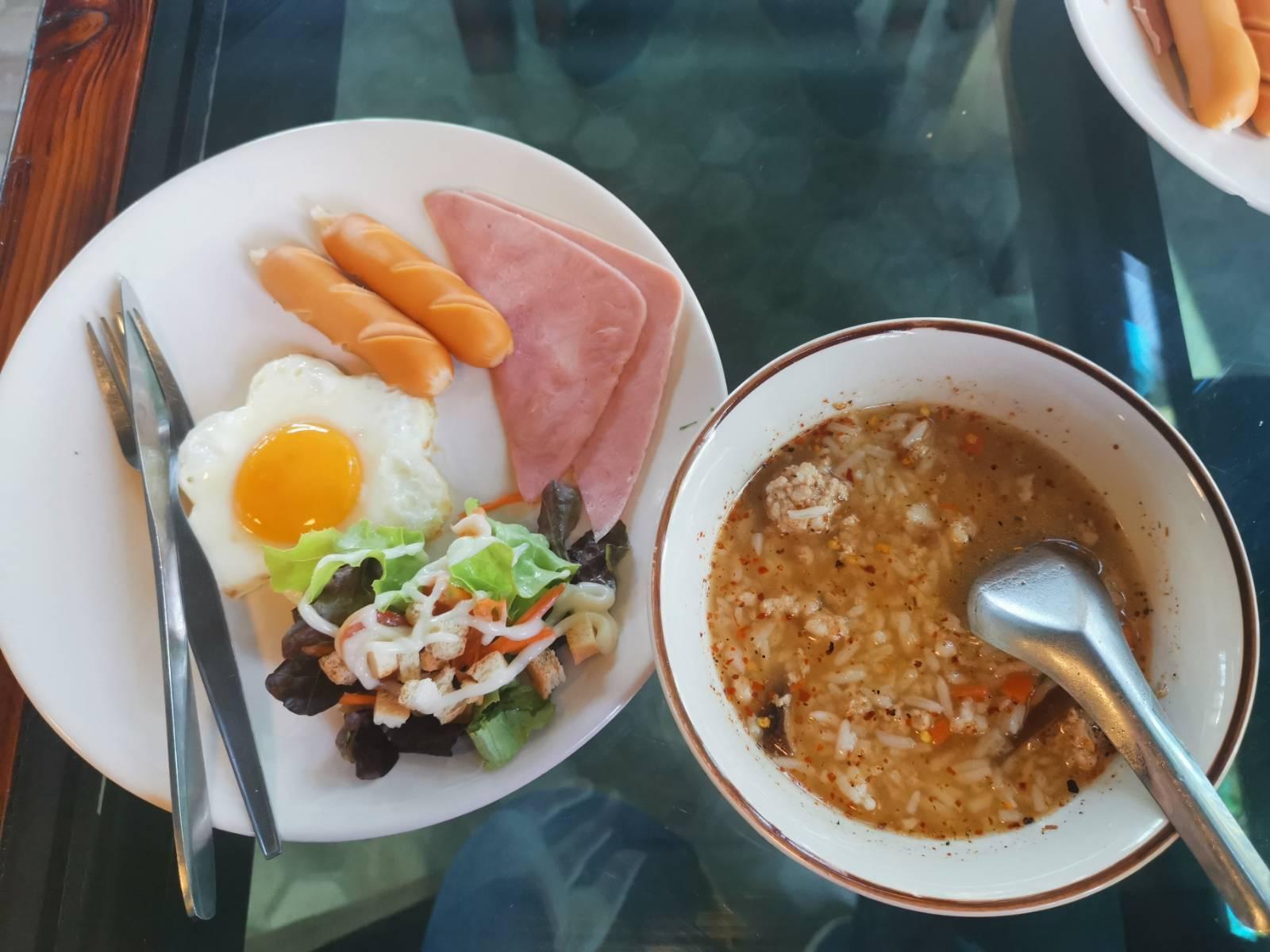 อาหารเช้าที่นี่จะมี AmericanBreakfast ให้คนละชุด แล้วมีข้าวต้มหมูให้ตักเอง พร้อมชา กาแฟ ขนมปังปิ้ง ไว้บริการ