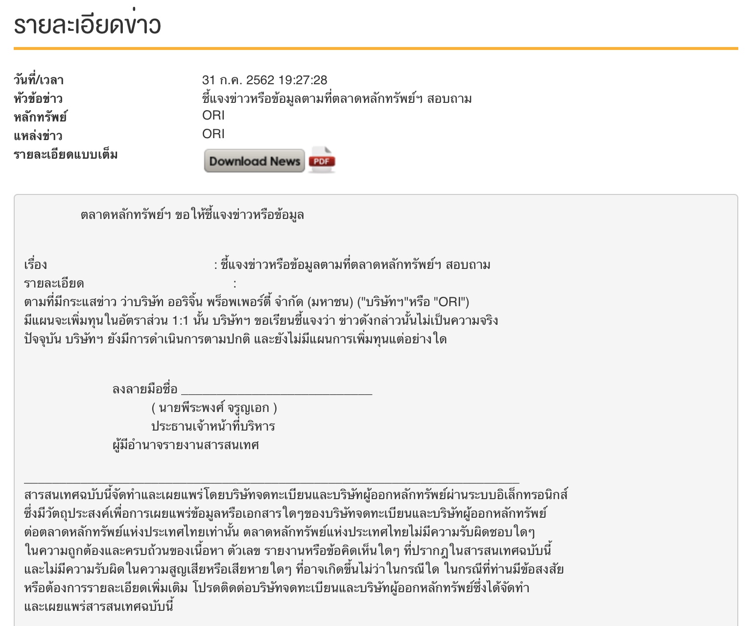 ข่าว ORI ล่าสุด..!! ผบห.ชี้แจงตลท. ปัดข่าวลือ ยืนยัน ไม่มีแผนเพิ่มทุน..!! !!