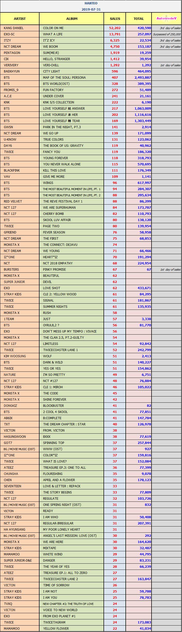 ยอดซื้ออัลบั้มจากชาร์ต HANTEO 31 กรกฎาคม 2562