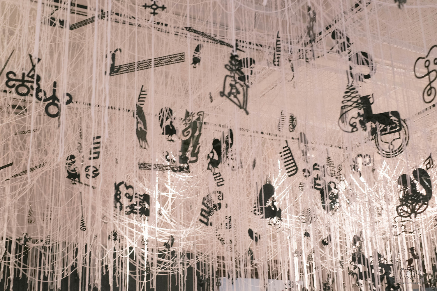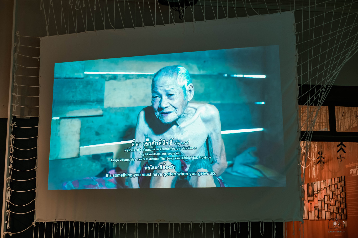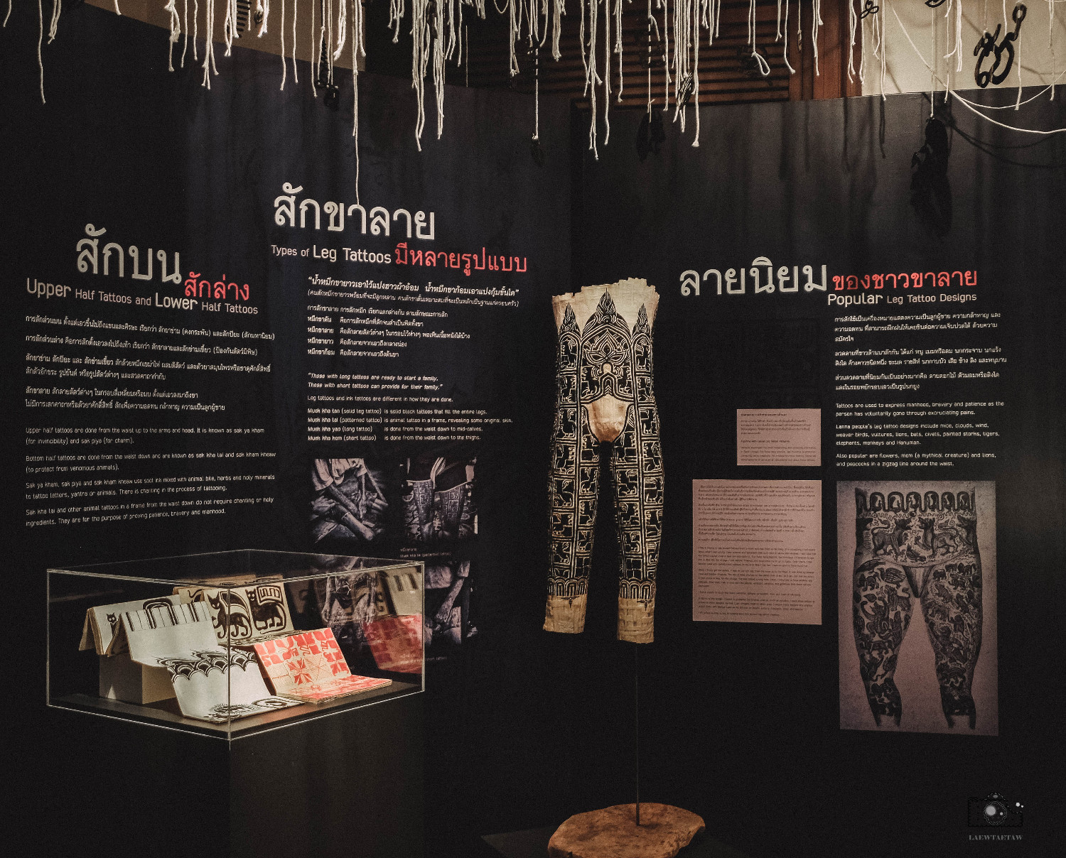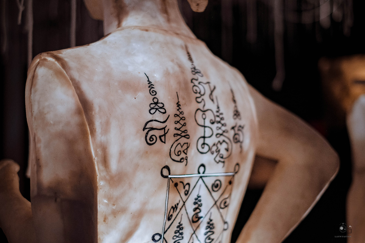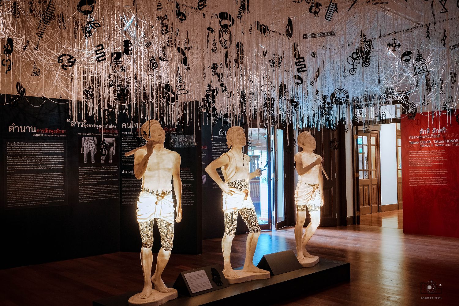มองไปด้านบนจะเห็นสัญลักษณ์รูปรอยสักในแบบต่างๆห้อยเรียงรายพร้อมกับด้ายสีขาวที่สื่อถึงสวรรค์ค่ะ