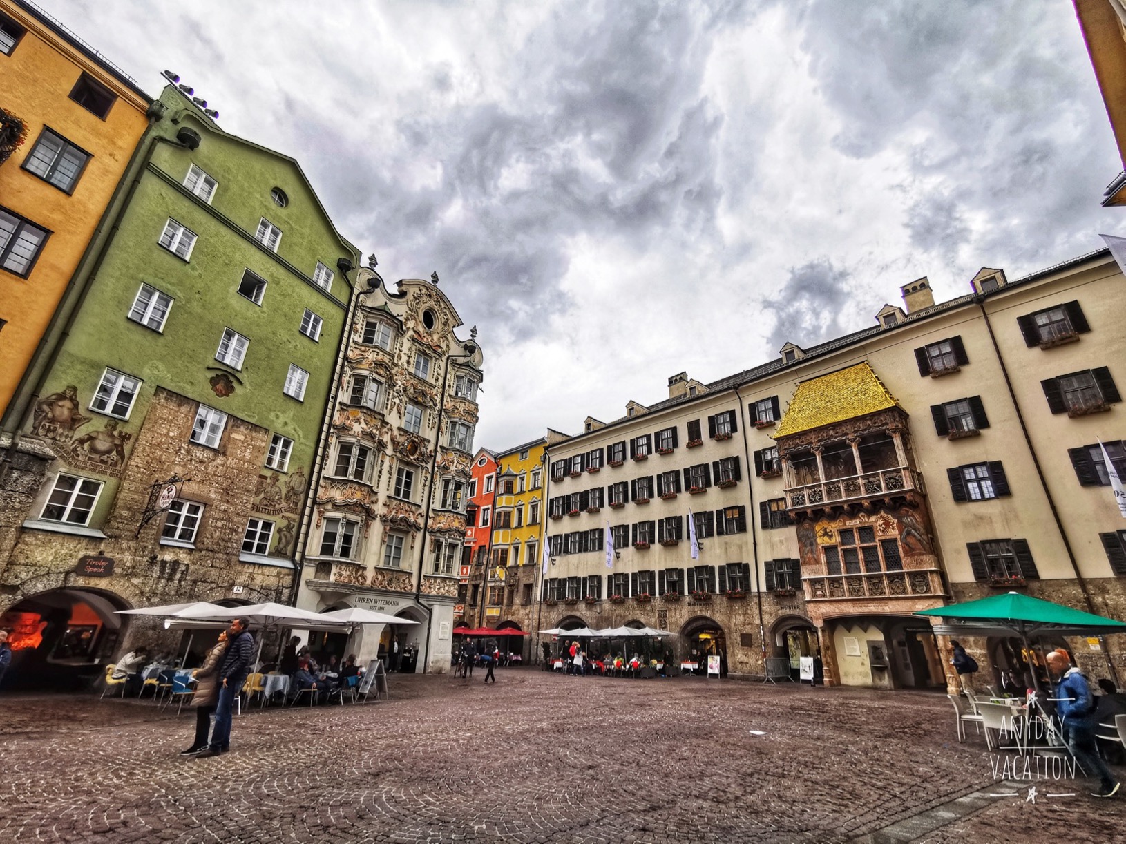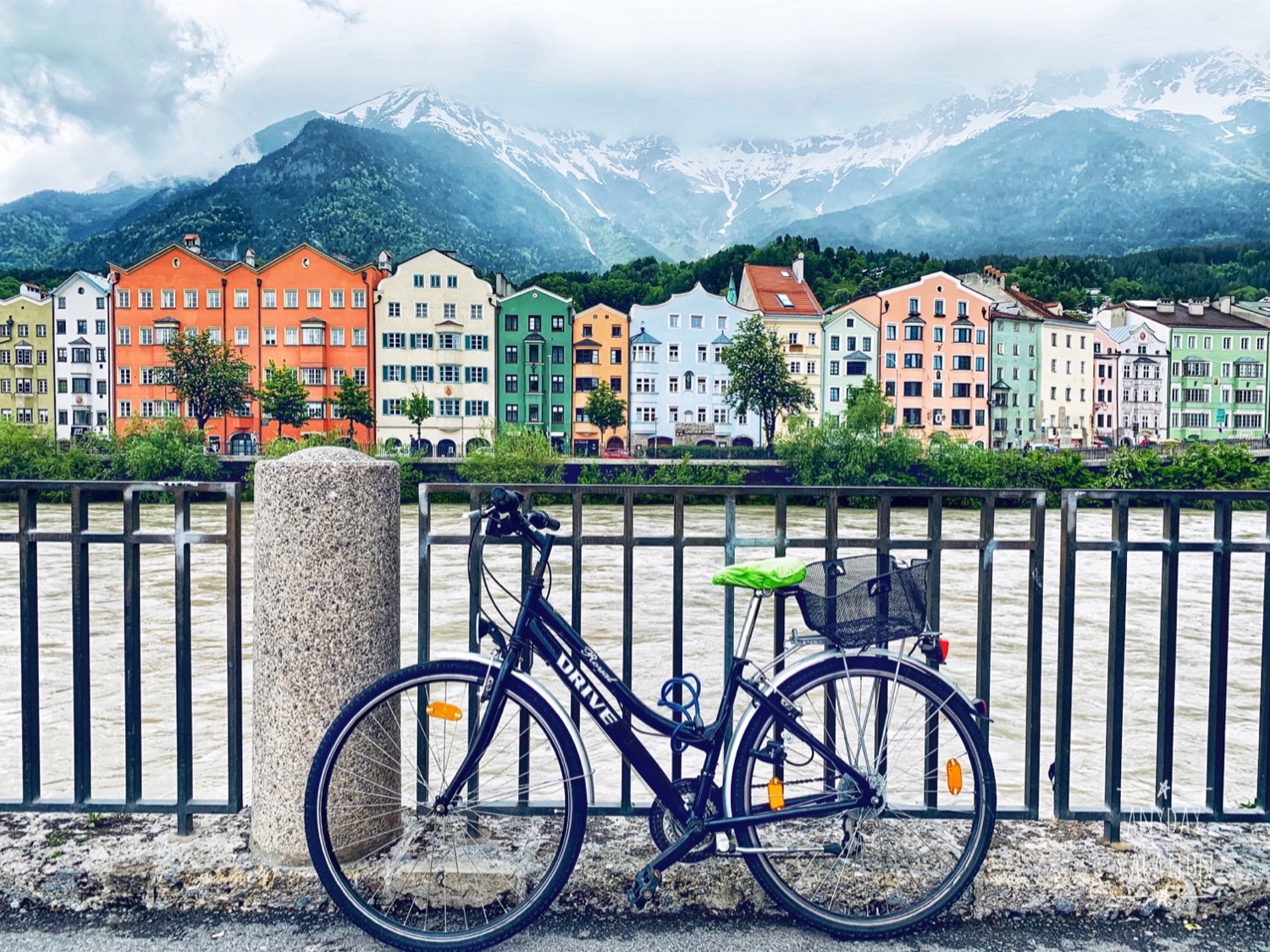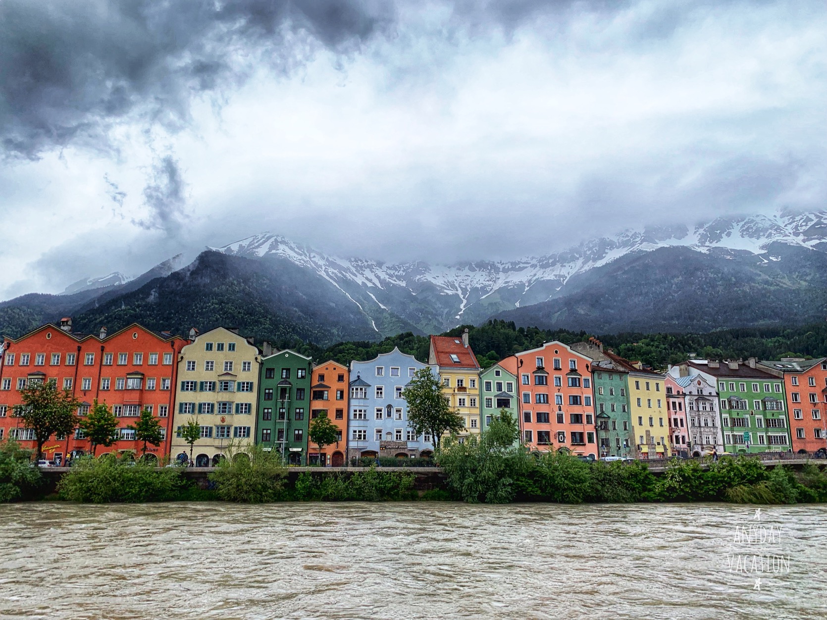 หลัง 5 โมงเย็นสถานที่ให้นักท่องเที่ยวเข้าชมมักจะปิดแล้ว พวกเราจึงออกเดินมุ่งหน้าสู่ Colorful houses of Innsbruck บนถนน Mariahilfstraße องค์ประกอบของสายน้ำ Inn โดยมีตัวตึกสีสันที่แตกต่างและเทือกเขาที่เป็นฉากหลังนั้น ทำให้ใครต่อใครต่างพากันหลงรักเมืองนี้