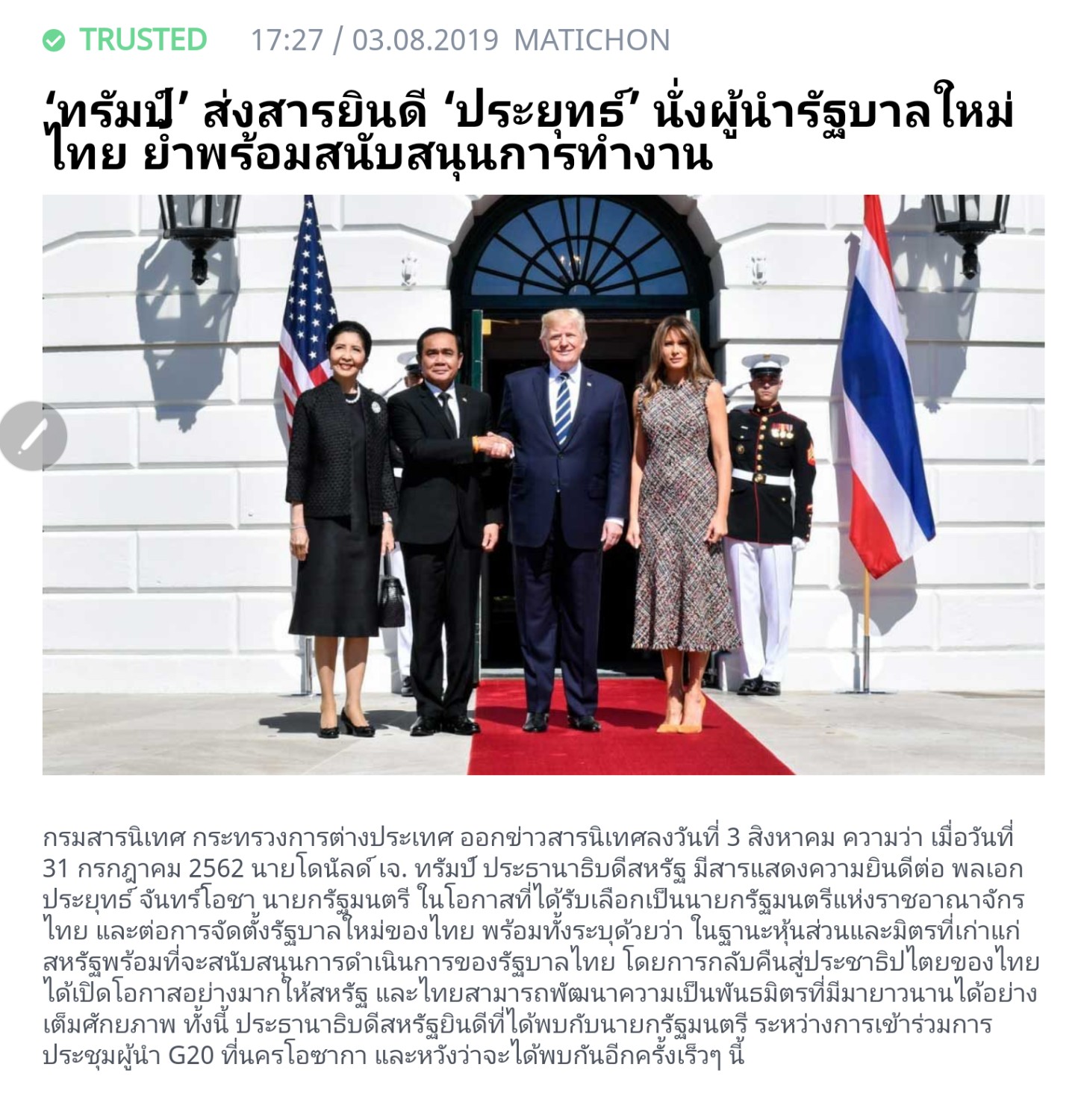 "เมื่อวันที่ 31 ก.ค. นายโดนัลด์ เจ. ทรัมป์ ประธานาธิบดีสหรัฐฯ มีสารแสดงความยินดีต่อพล.อ.ประยุทธ์ จันทร์โอชา นายกรัฐมนตรี ในโอกาสที่ได้รับเลือกเป็นนายกรัฐมนตรีแห่งราชอาณาจักรไทยและต่อการจัดตั้งรัฐบาลใหม่ของไทย พร้อมทั้งได้ระบุด้วยว่า ในฐานะหุ้นส่วนและมิตรที่เก่าแก่ สหรัฐฯ พร้อมที่จะสนับสนุนการดำเนินการของรัฐบาลไทย โดยการกลับคืนสู่ประชาธิปไตยของไทยได้เปิดโอกาสอย่างมากให้สหรัฐฯ และไทยสามารถพัฒนาความเป็นพันธมิตรที่มีมายาวนานได้อย่างเต็มศักยภาพ ทั้งนี้ นายทรัมป์ ยินดีที่ได้พบกับนายกรัฐมนตรี ระหว่างการเข้าร่วมการประชุมผู้นำ G20 ที่นครโอซากา และหวังว่าจะได้พบกันอีกครั้งเร็วๆนี้"