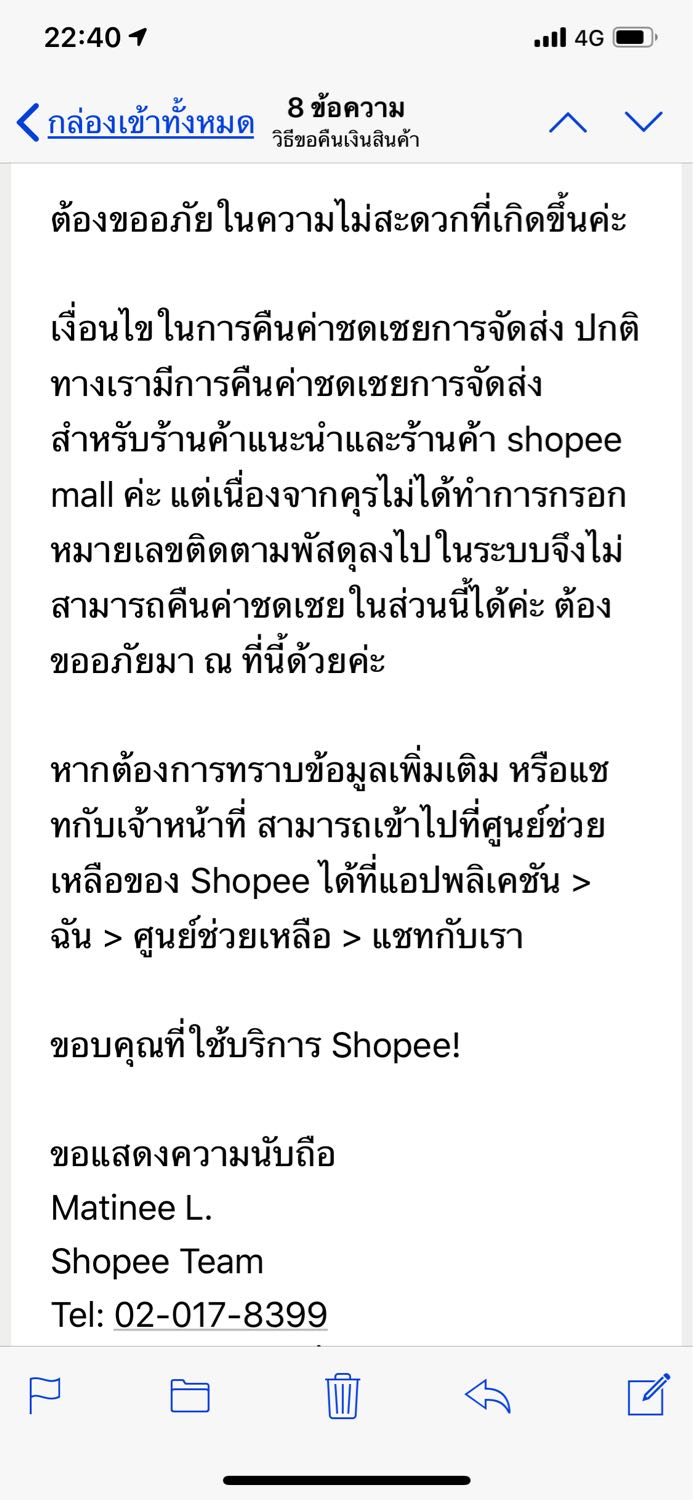 ผลสรุป. ทาง shopee เสียใจ ที่ผมไม่ได้กรอก ในแอพ จึงไม่สามารถ คืนเงินได้