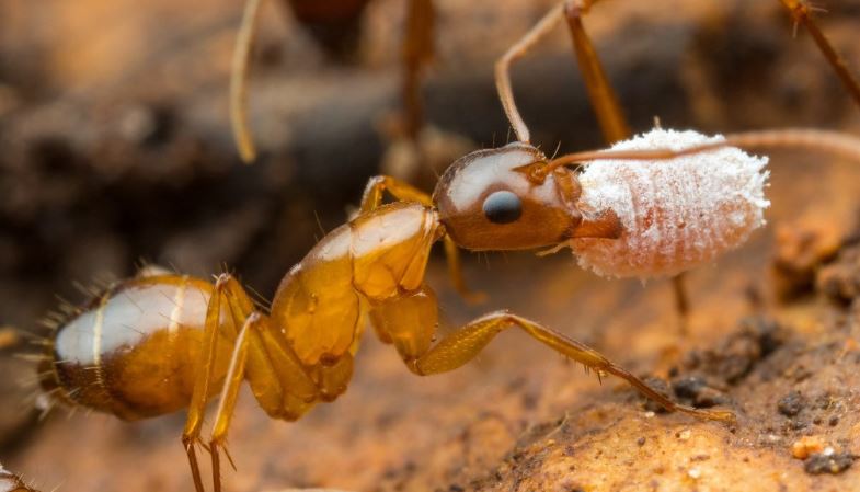ภาพมดกำลังคาบ "ย้าย" เพลี้ยไปที่อื่น