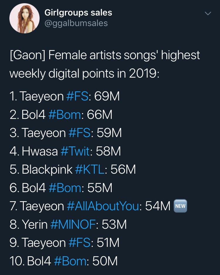 🥇 เพลง 4SS ของแทยอน ครองอันดับ 1 ของศลป.หญิงเดี่ยว ที่มีดาวโหลดเพลงสูงสุดในปี 2019