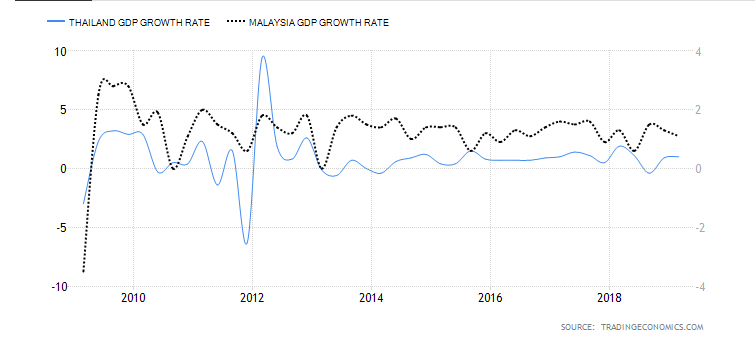 อัตราการเติบโตของ GDP ไทยค่อนข้างต่ำมากในขณะที่เราอัดเงินลงทุนภาครัฐเข้าไปมหาศาลอัตราการโตน้อยกว่ามาเลยเซีย ซึ่งไม่ควรเป็นเช่นนั้น เพราะฐาน GDP per capita ของมาเลเซีย สิงคโปร์ มากกว่าไทย ถ้าเราไปเทียบกับพวก CLMV แล้วโตน้อยกว่าเขาก็พอเข้าใจได้เพราะฐานเรามากว่าเขา