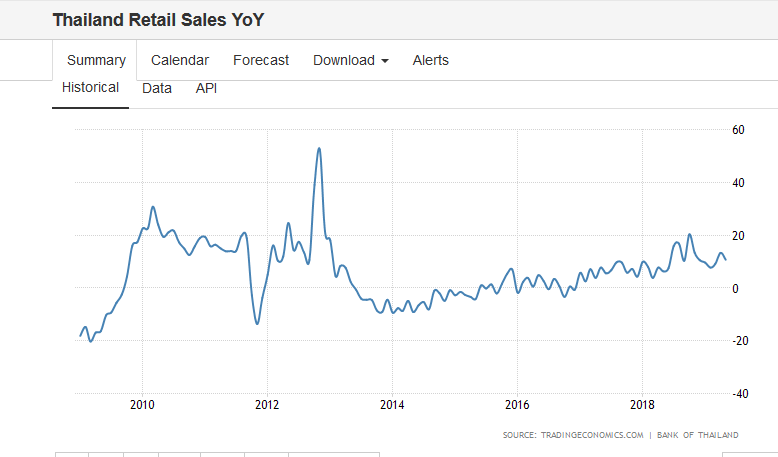 อัตราการค้าปลีก retail sales ของเราก็ทรงๆมาตั้งแต่ ปี 2013 ช่วง 4-5 ปีที่ผ่านมาเกือบต่ำเข้าไปแตะช่วงน้ำท่วมในปี 2011 ด้วยซ้ำทั้งๆที่มันไม่ควรเป็นเช่นนั้นในวันที่เรามีนักท่องเที่ยวจีนมาถล่มประเทศในช่วงที่ผ่านมา ลองนึกดูว่าถ้าไม่มีนักท่องเที่ยวจีนจะเกิดอะไรขึ้น