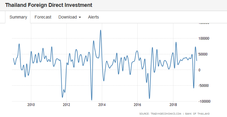 อัตราการลงทุนจากต่างประเทศ ก็ทรงๆ แต่ก็ไม่เคยเข้าไปแตะในระดับ peak 2013 ได้แถมปีที่ผ่านมาทรุดหนักลงไปอีก
